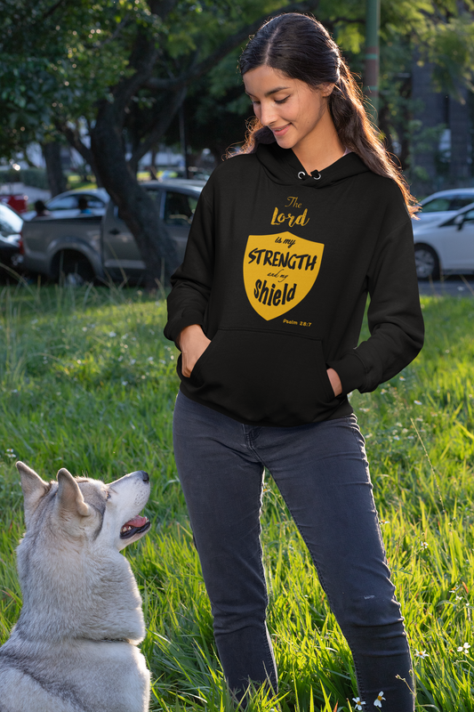 Black "The Lord is my strength and my shield" christian unisex hooded sweatshirt