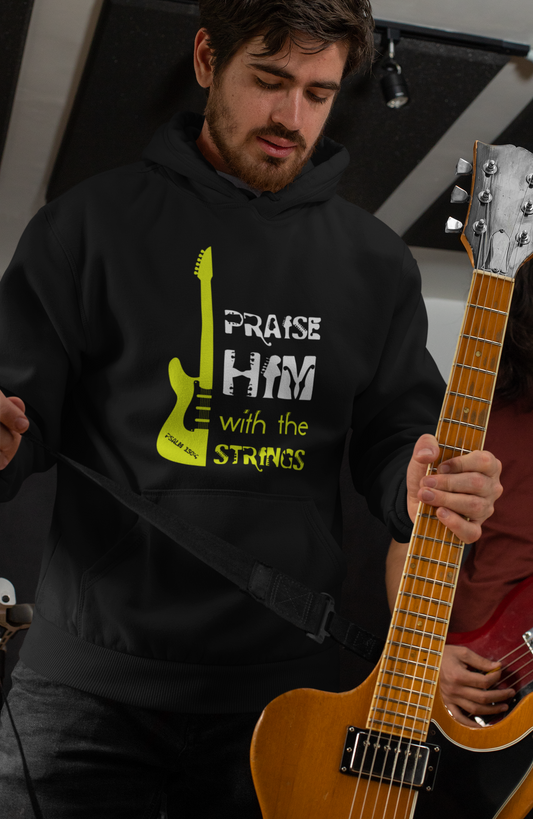 Black "Praise him with the strings" unisex christian hooded sweatshirt