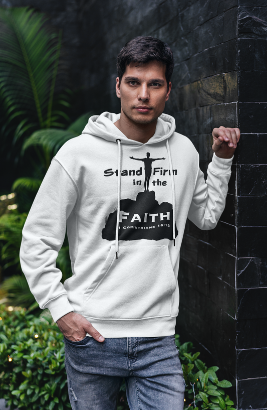 White "Stand Firm in the Faith" christian unisex hooded sweatshirt
