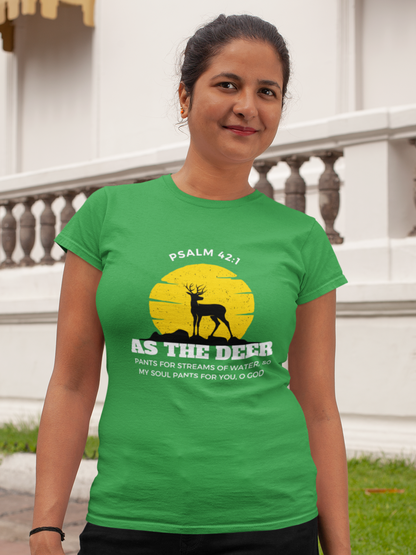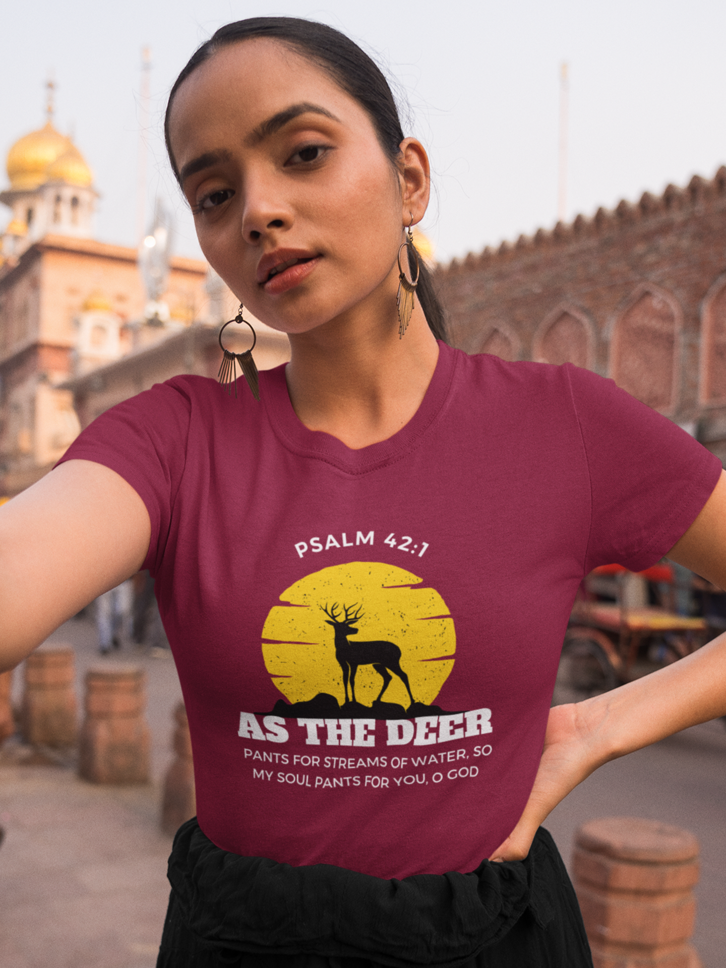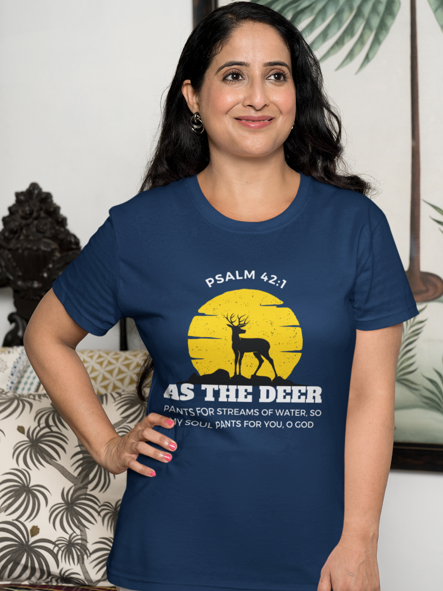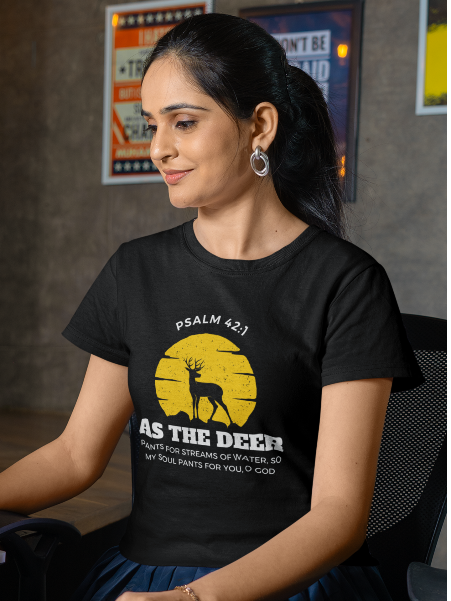 Dive into the depths of devotion with our "As the Deer Pants" T-shirt, featuring the complete verse from Psalm 42:1: