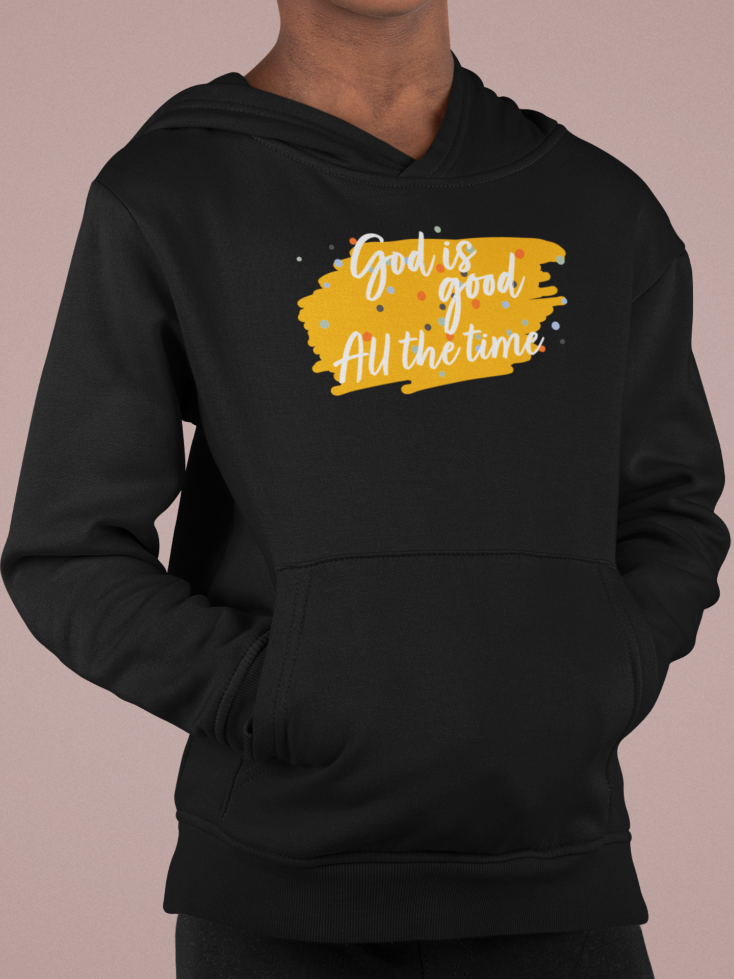 Black "God is good All the time" kids christian hooded sweatshirt
