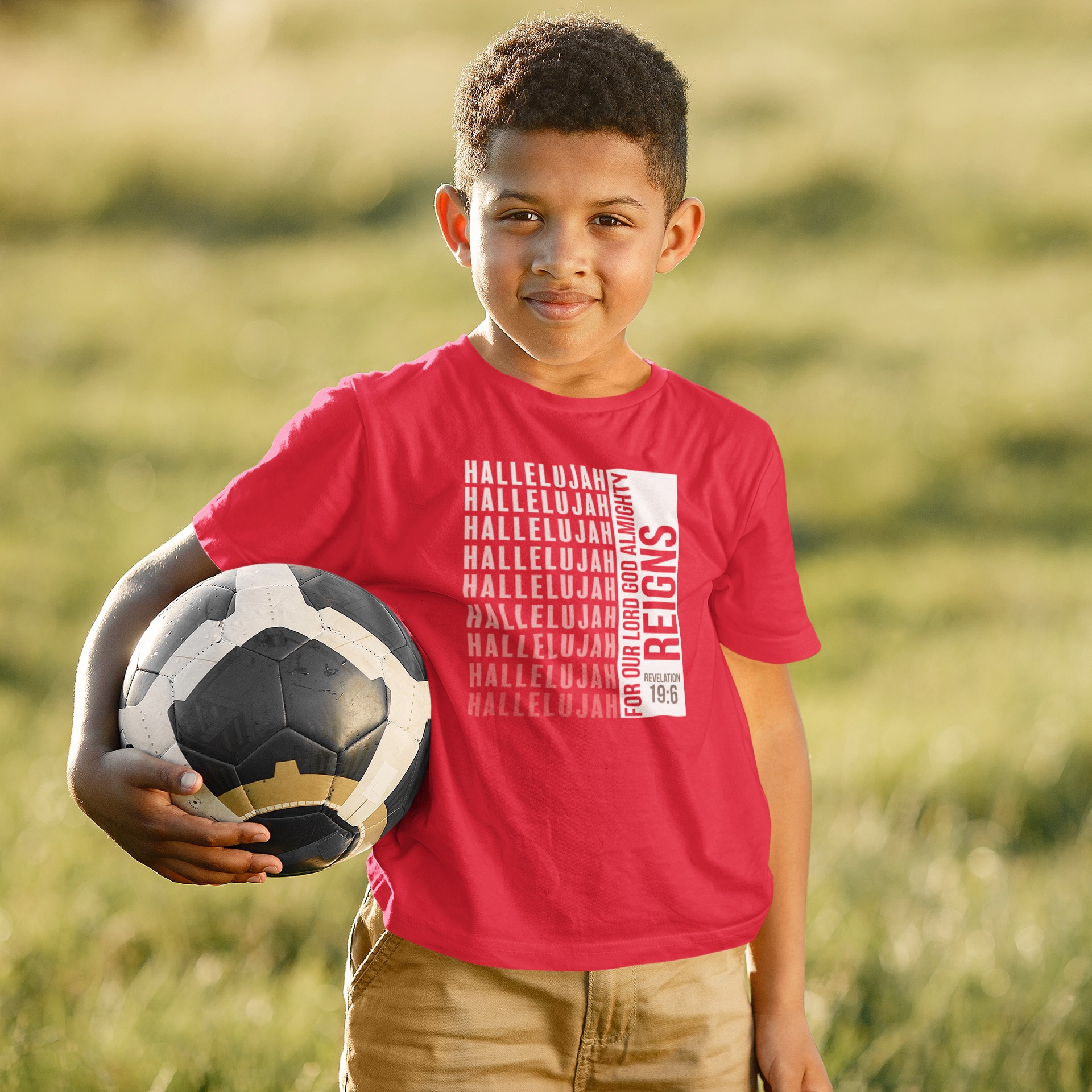 Red "Hallelujah for our Lord God Almighty reigns" boys christian t-shirt