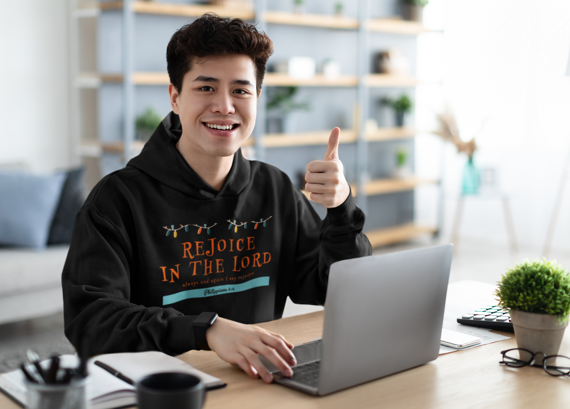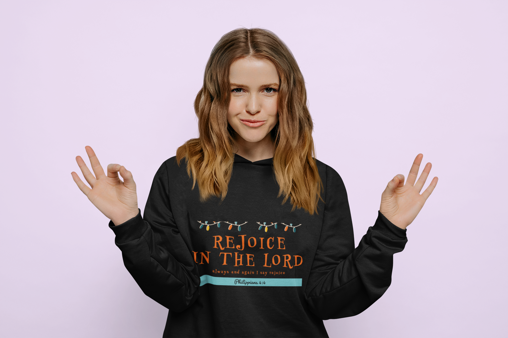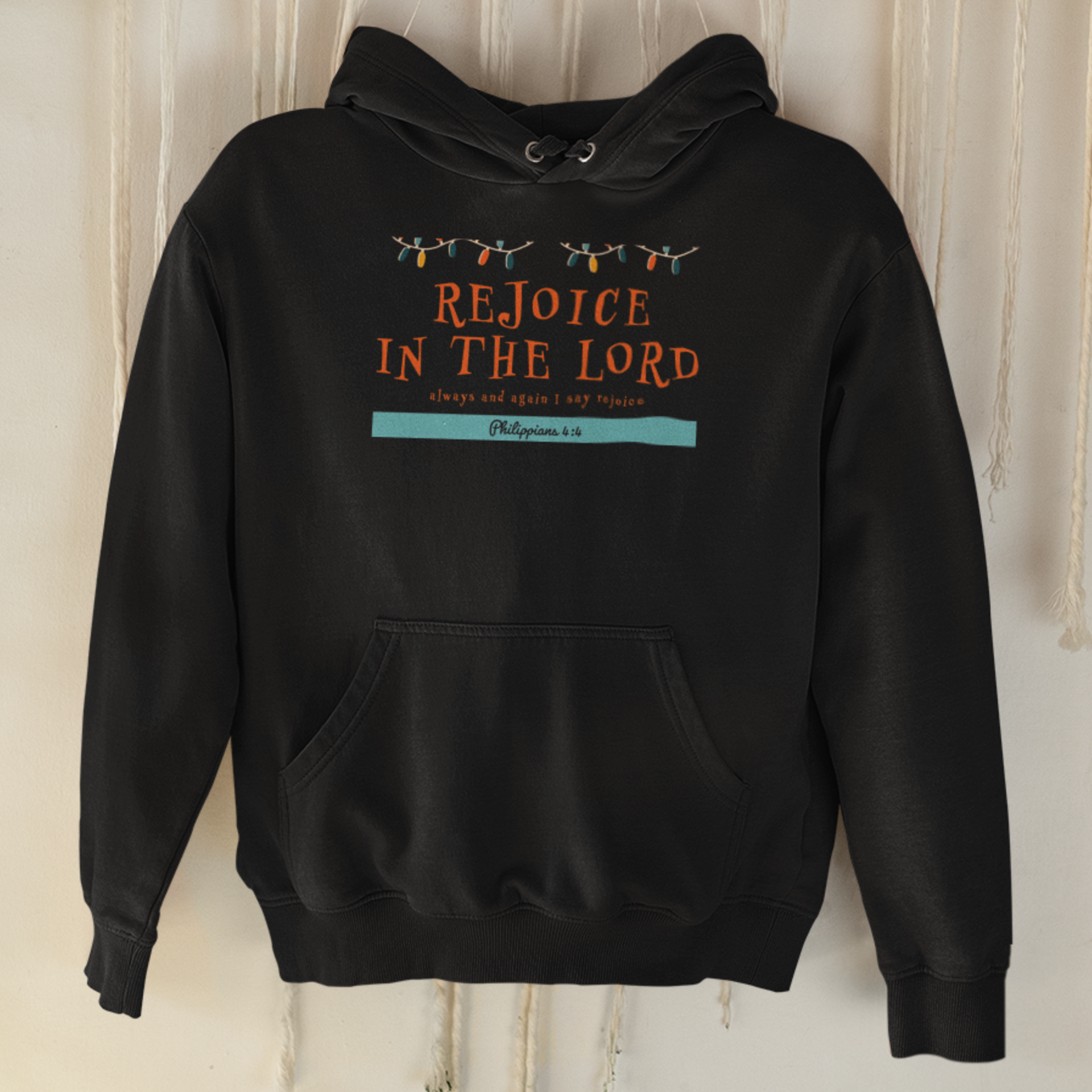 Black "Rejoice in the Lord" unisex Christian hooded sweatshirt
