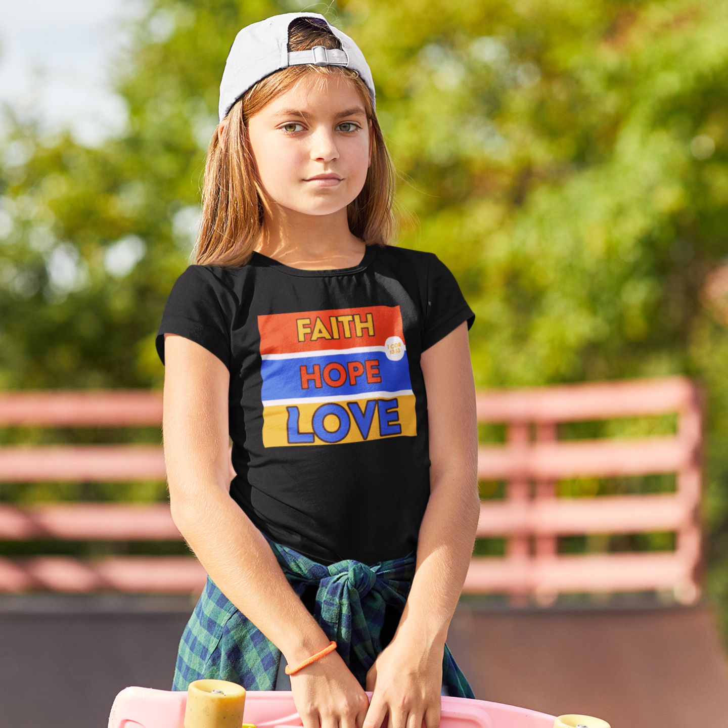 Black "Faith Hope Love - 1 Cor 13:13" girls christian t-shirt