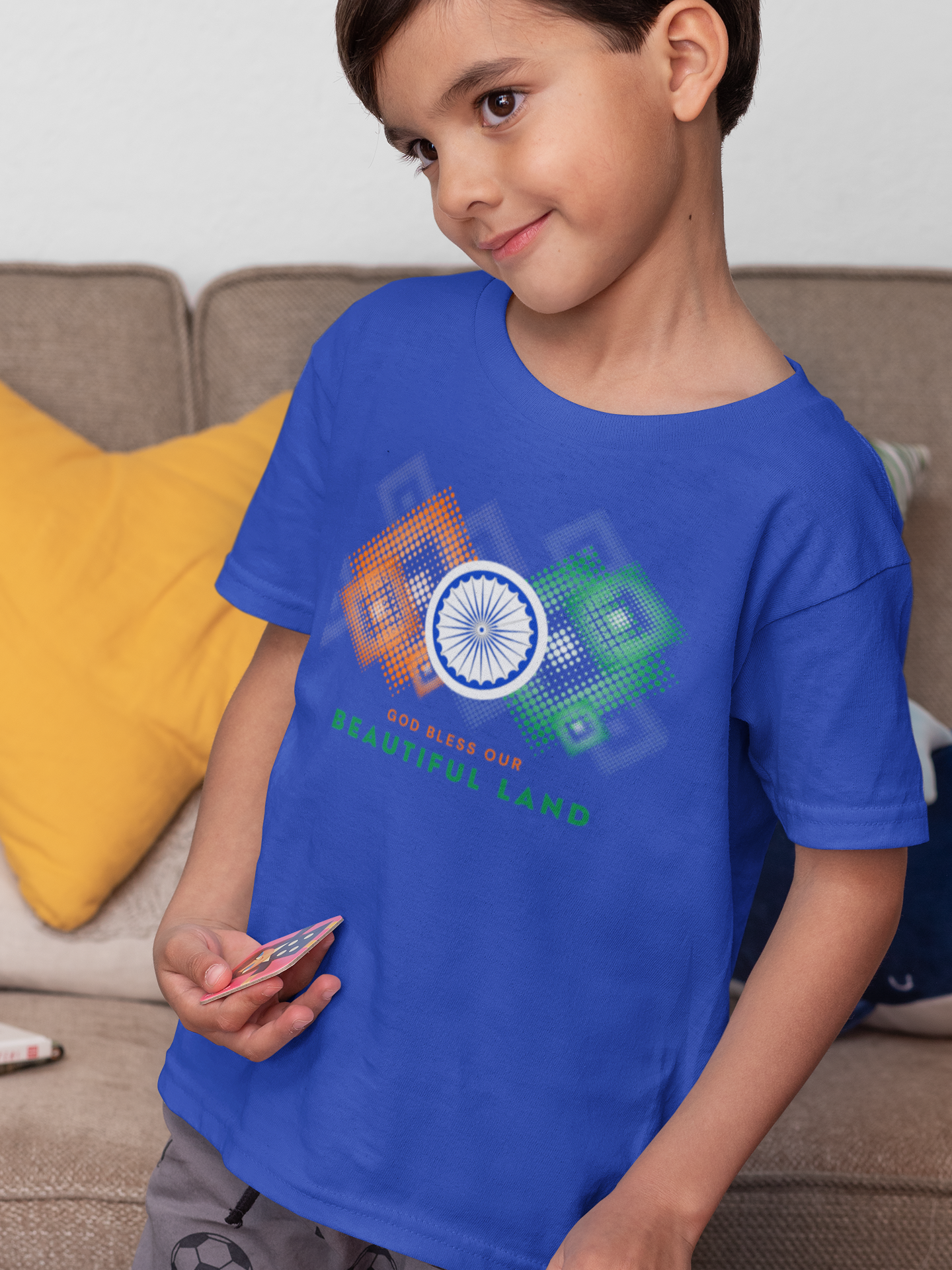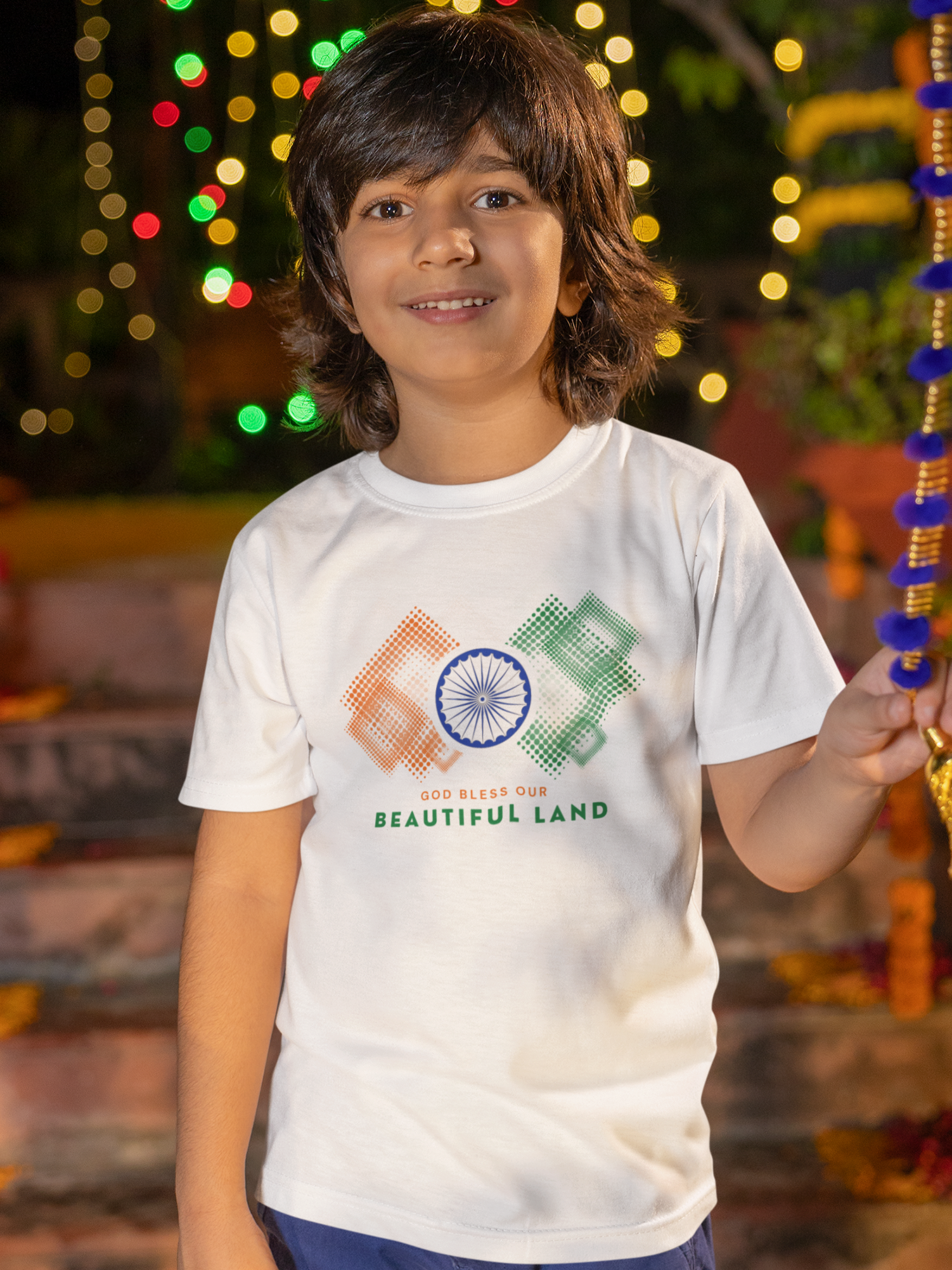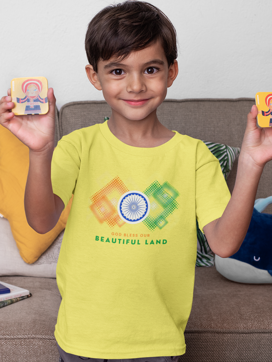 Celebrate your love for India with a touch of faith with our "God Bless Our Beautiful Land" T-Shirt. Designed with a beautiful pattern in the vibrant colors of the Indian flag and featuring the Ashok Chakra at the center, this T-shirt is a perfect blend of patriotism and spirituality. Whether worn on special occasions or as a daily expression of pride and faith, this T-shirt serves as a heartfelt prayer for our nation's well-being and prosperity.