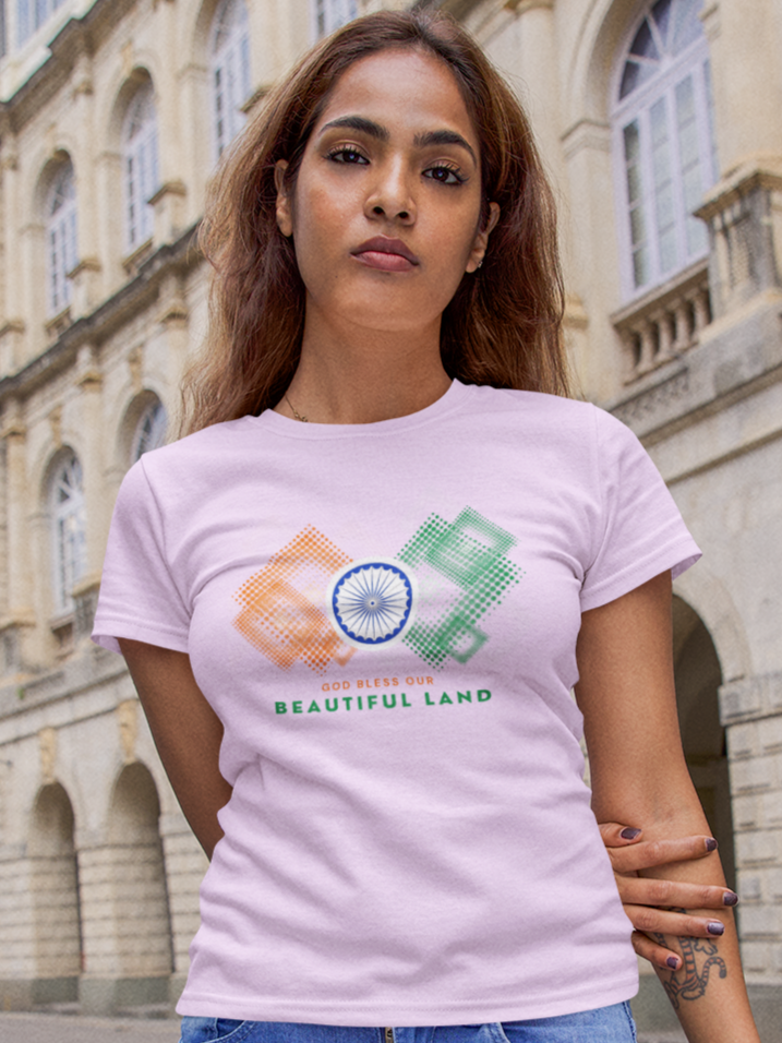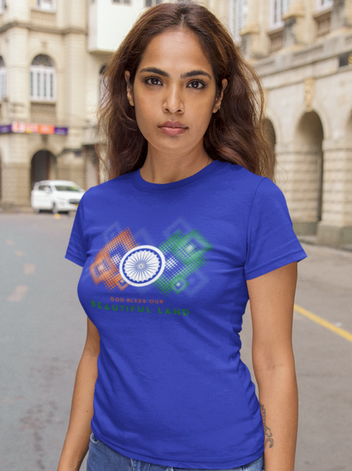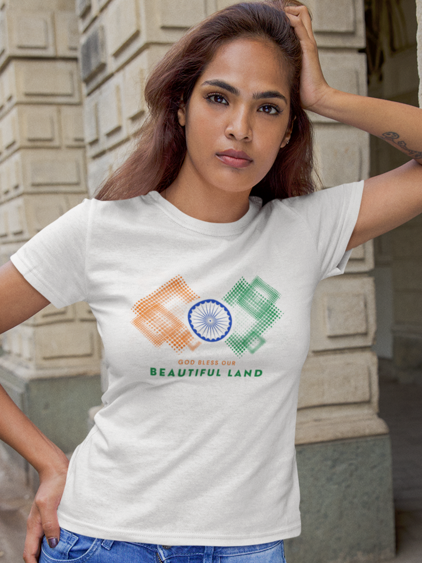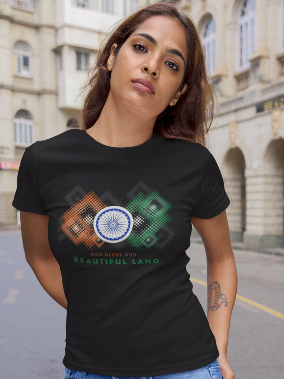 Celebrate your love for India with a touch of faith with our "God Bless Our Beautiful Land" T-Shirt. Designed with a beautiful pattern in the vibrant colors of the Indian flag and featuring the Ashok Chakra at the center, this T-shirt is a perfect blend of patriotism and spirituality. Whether worn on special occasions or as a daily expression of pride and faith, this T-shirt serves as a heartfelt prayer for our nation's well-being and prosperity.