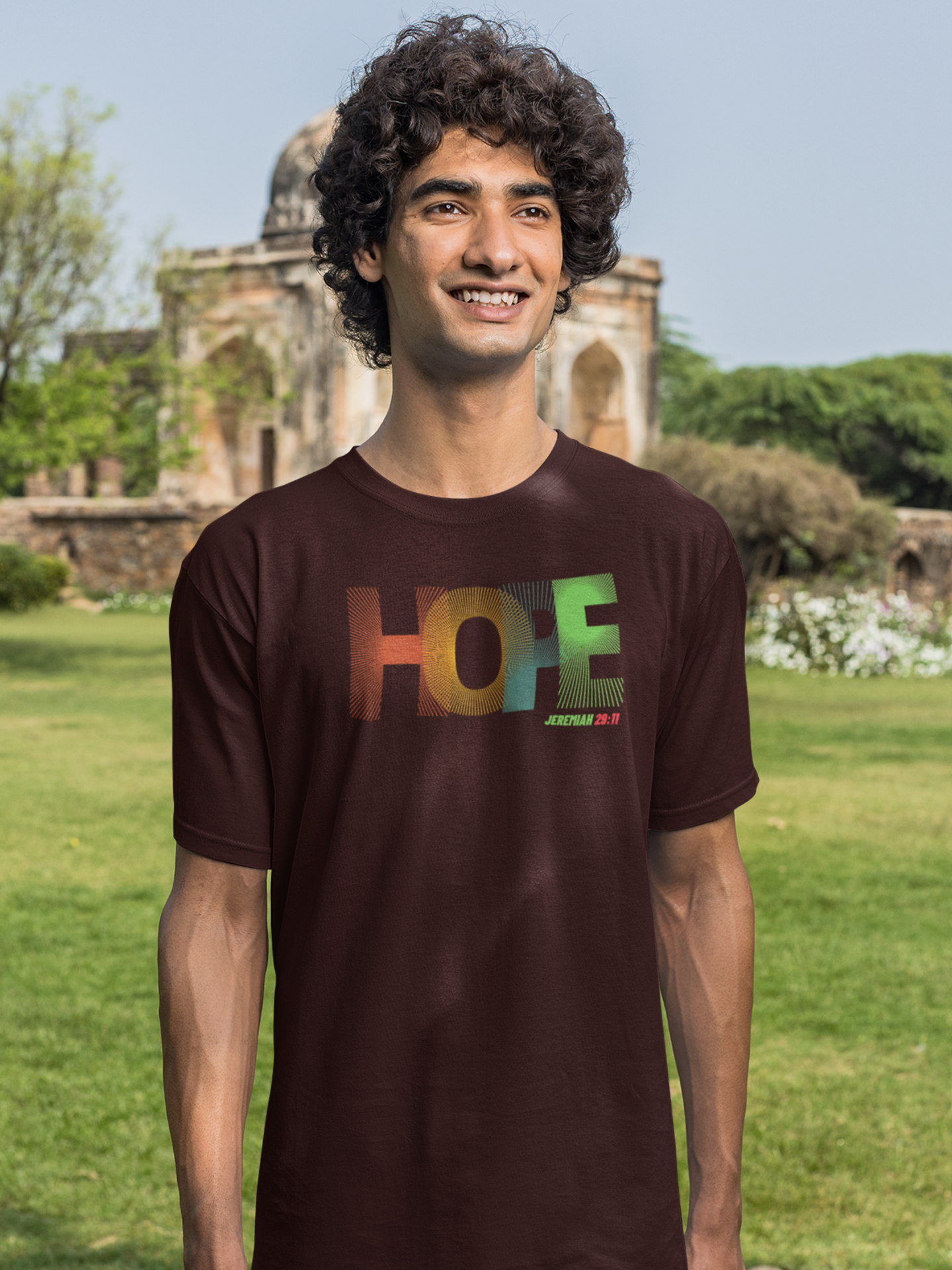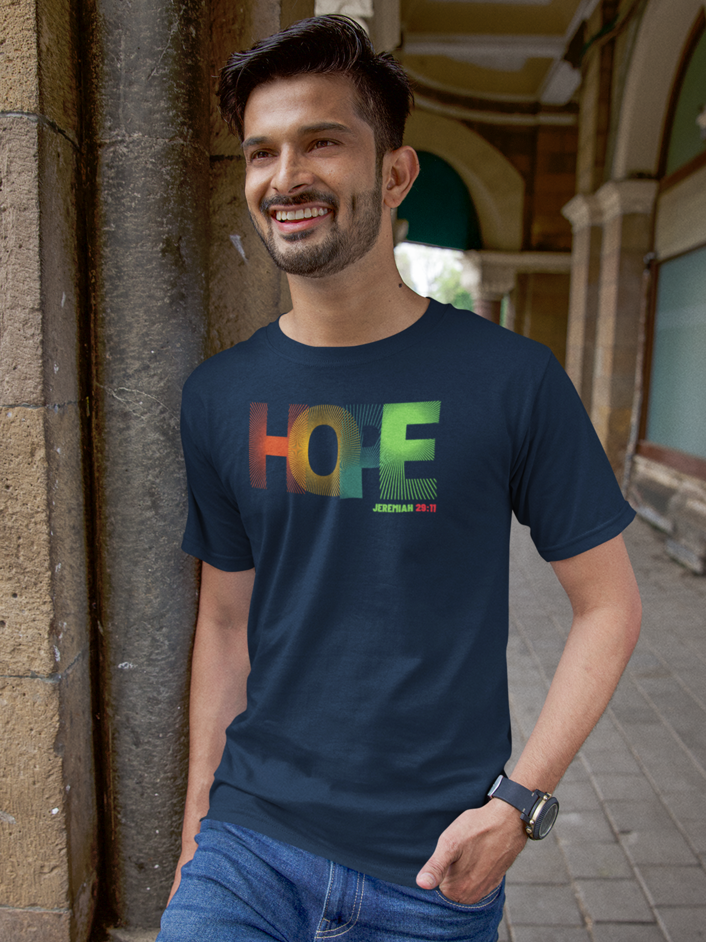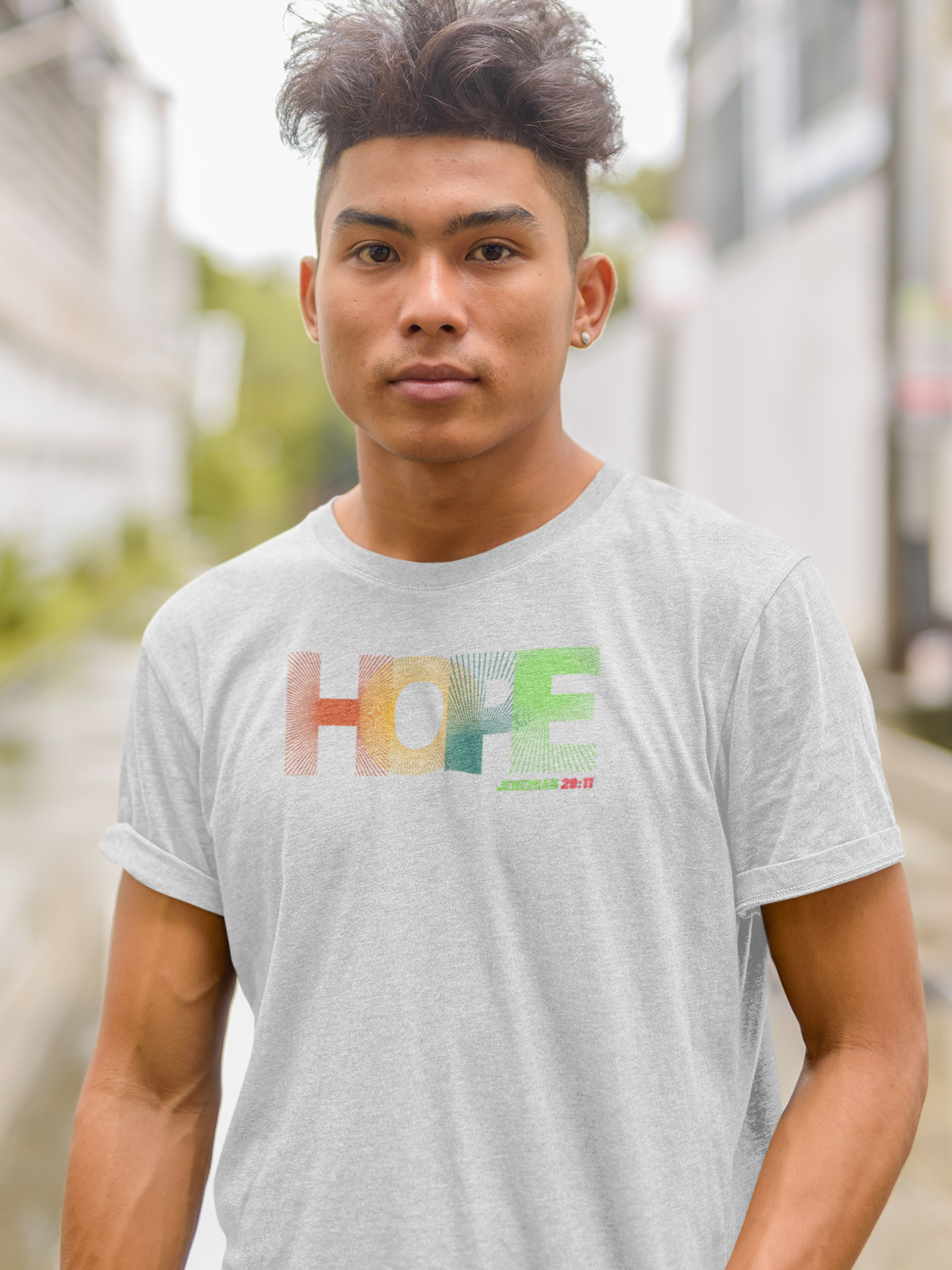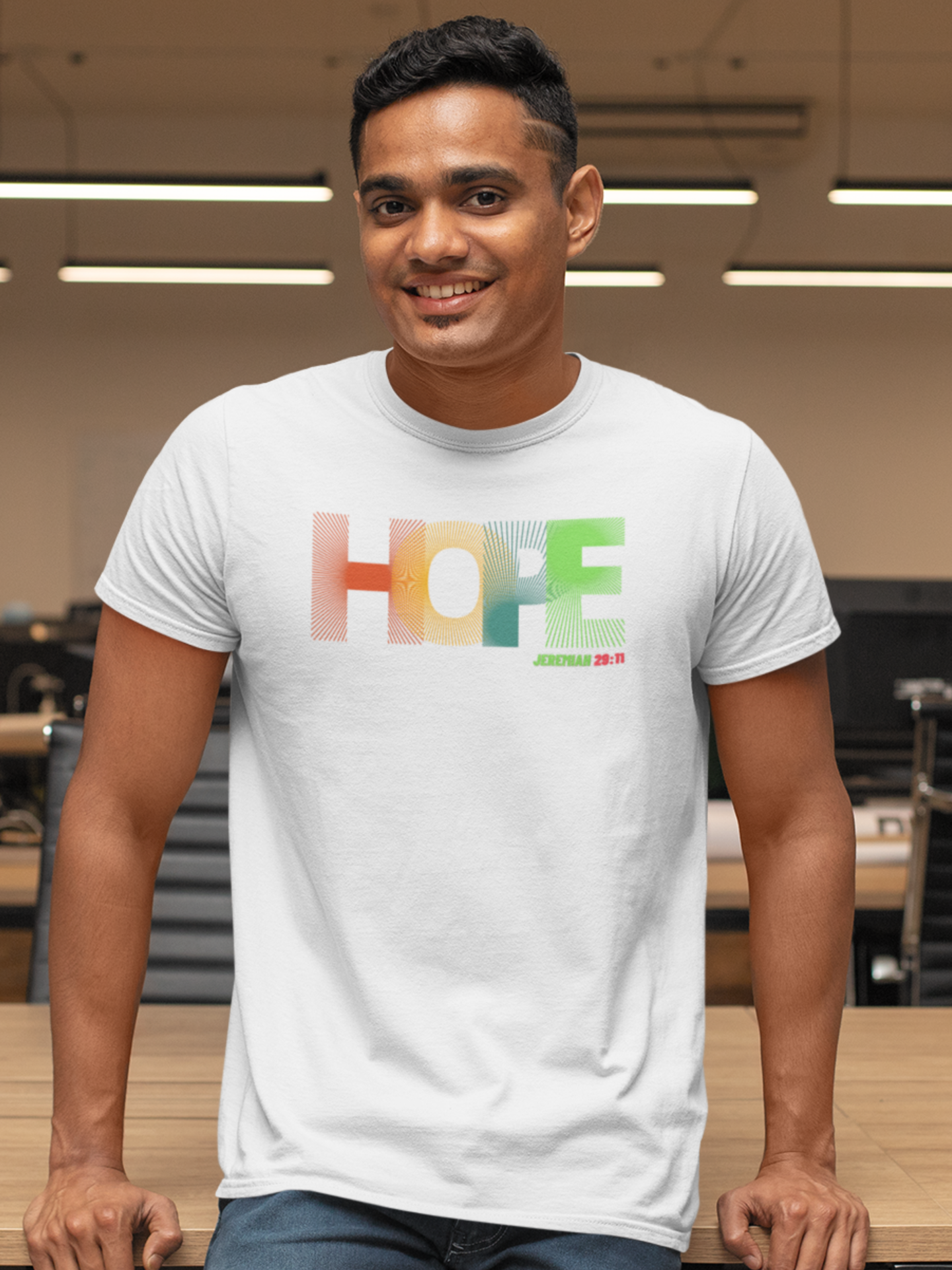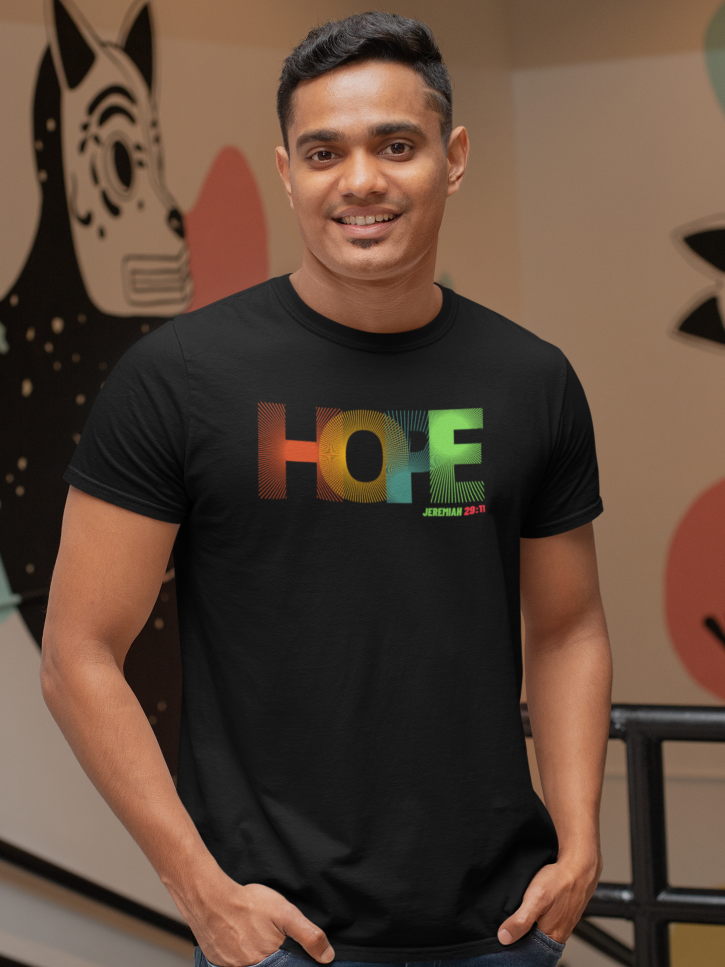 This unisex "Hope" t-shirt features a pleasing crew neck design and is adorned with the timeless bible verse, Jeremiah 29:11 - "For I know the plans I have for you," declares the Lord, "plans to prosper you and not to harm you, plans to give you hope and a future." Wear it proudly!