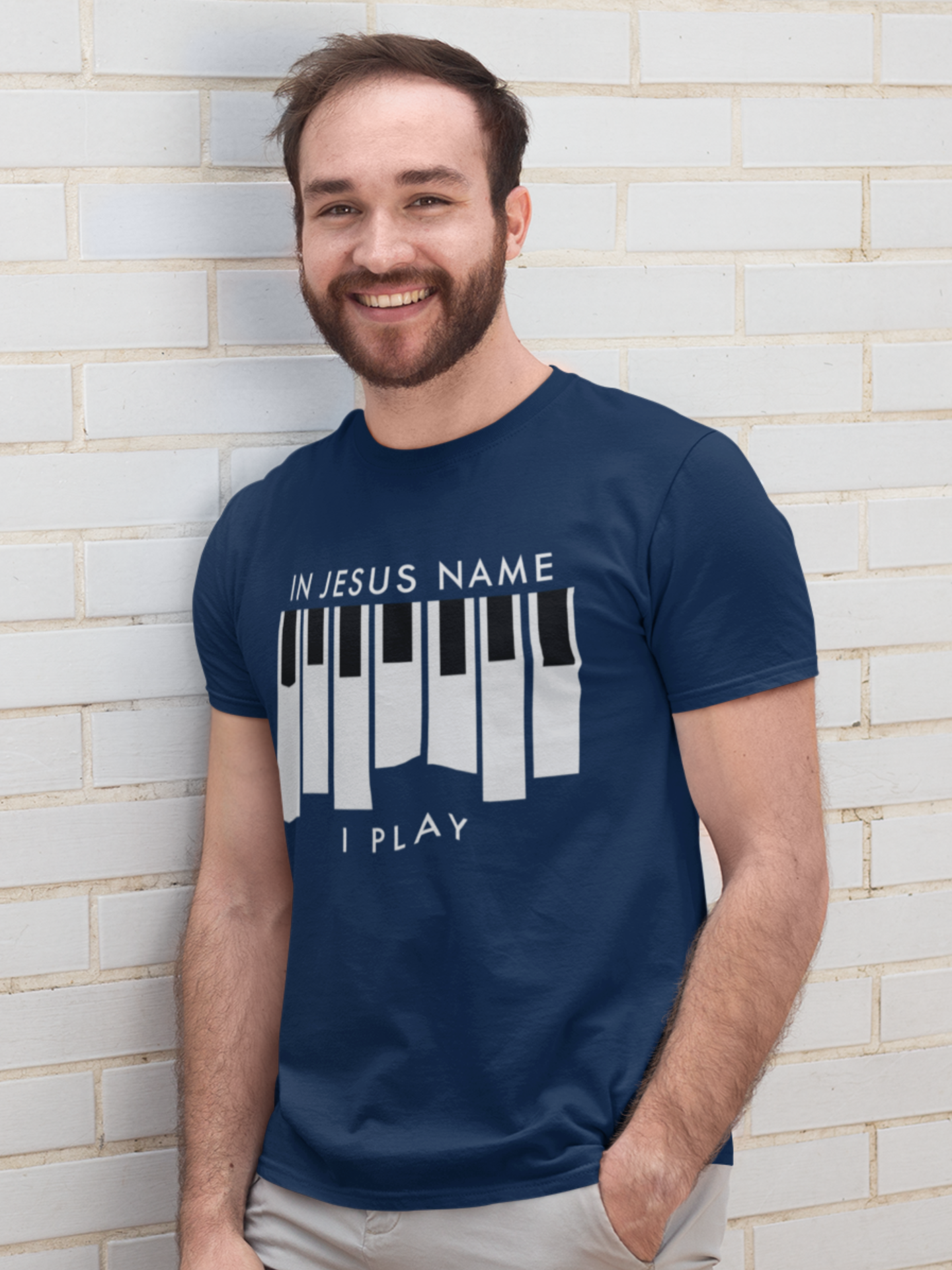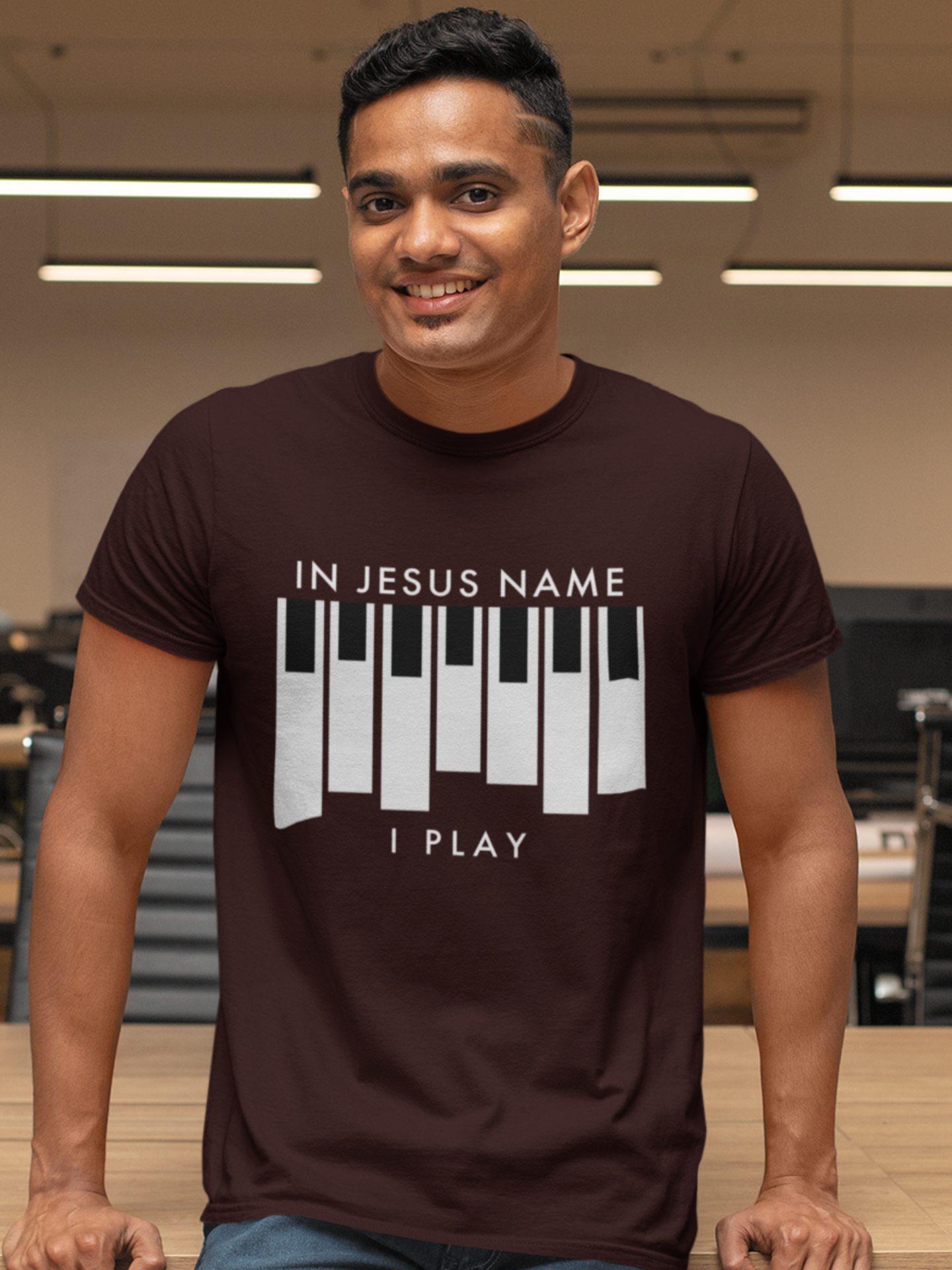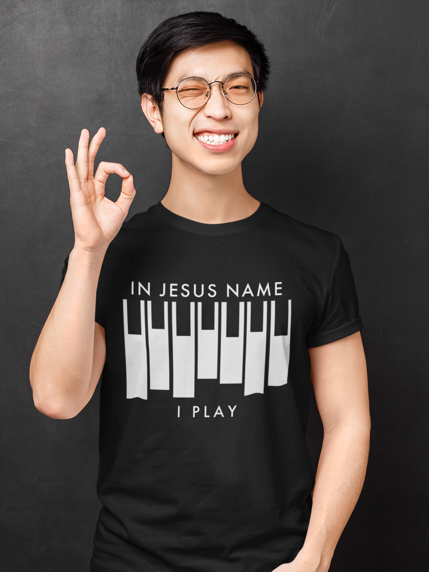 Crafted with the utmost care and attention to detail, this t-shirt exudes elegance and style. The design features a sleek piano keyboard embedded within the silhouette of the text, which reads "In Jesus' Name, I Play" The combination of the piano keys and the faithful statement creates a harmonious blend that is sure to resonate with musicians and believers alike.
