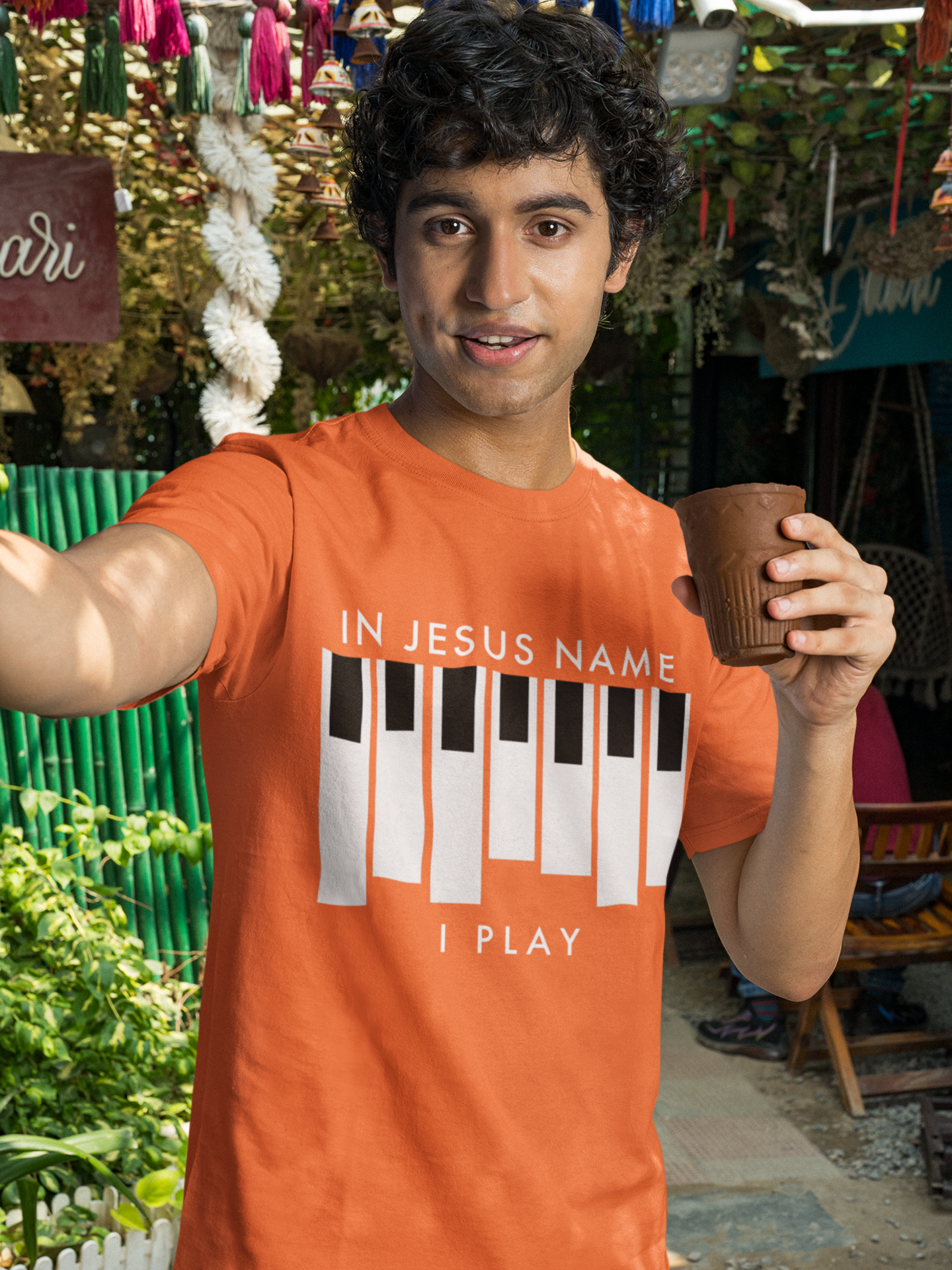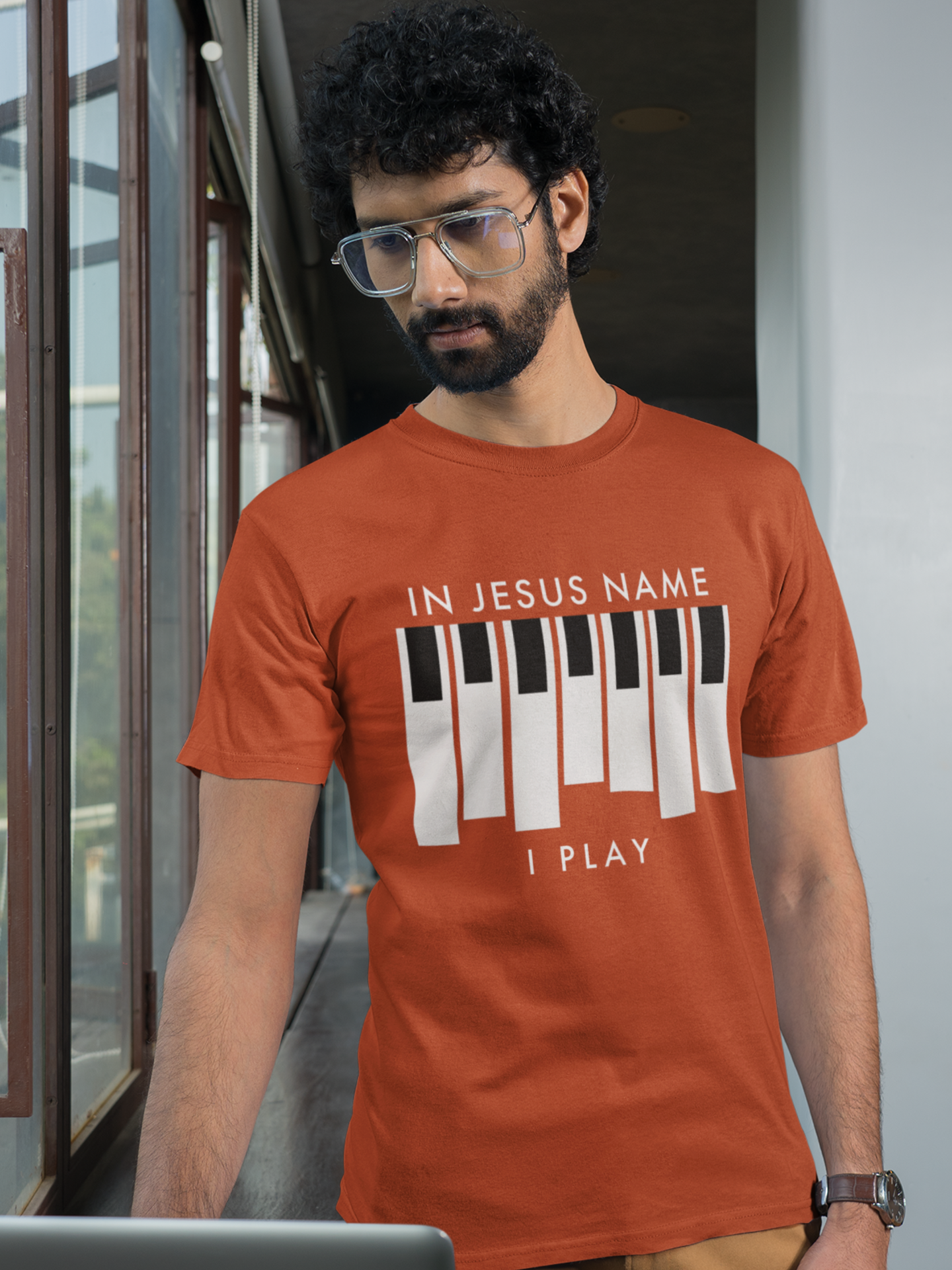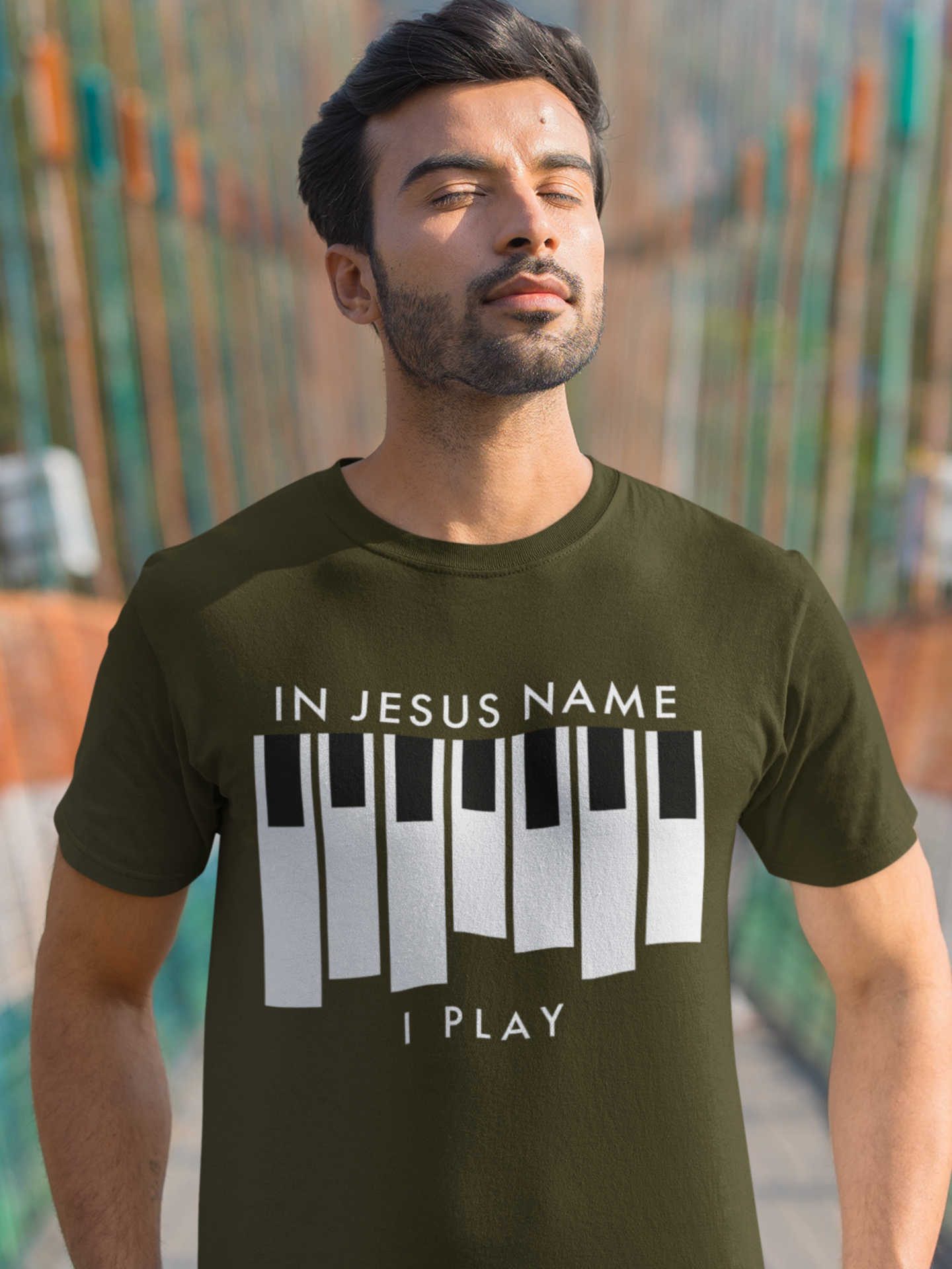 Crafted with the utmost care and attention to detail, this t-shirt exudes elegance and style. The design features a sleek piano keyboard embedded within the silhouette of the text, which reads "In Jesus' Name, I Play" The combination of the piano keys and the faithful statement creates a harmonious blend that is sure to resonate with musicians and believers alike.