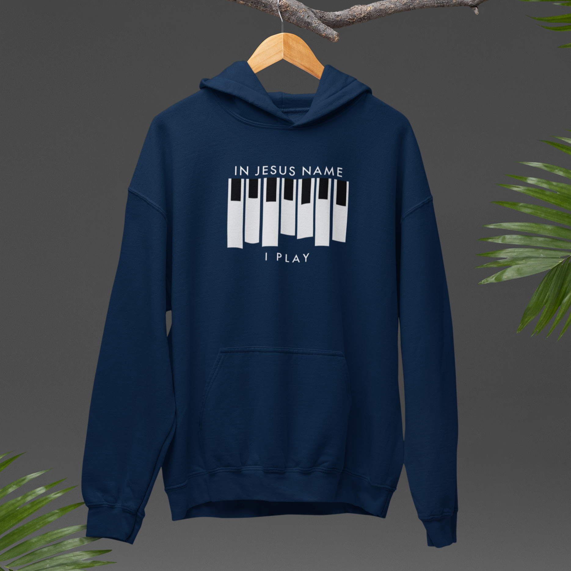 Crafted with the utmost care and attention to detail, this t-shirt exudes elegance and style. The design features a sleek piano keyboard embedded within the silhouette of the text, which reads "In Jesus' Name, I Play" The combination of the piano keys and the faithful statement creates a harmonious blend that is sure to resonate with musicians and believers alike.