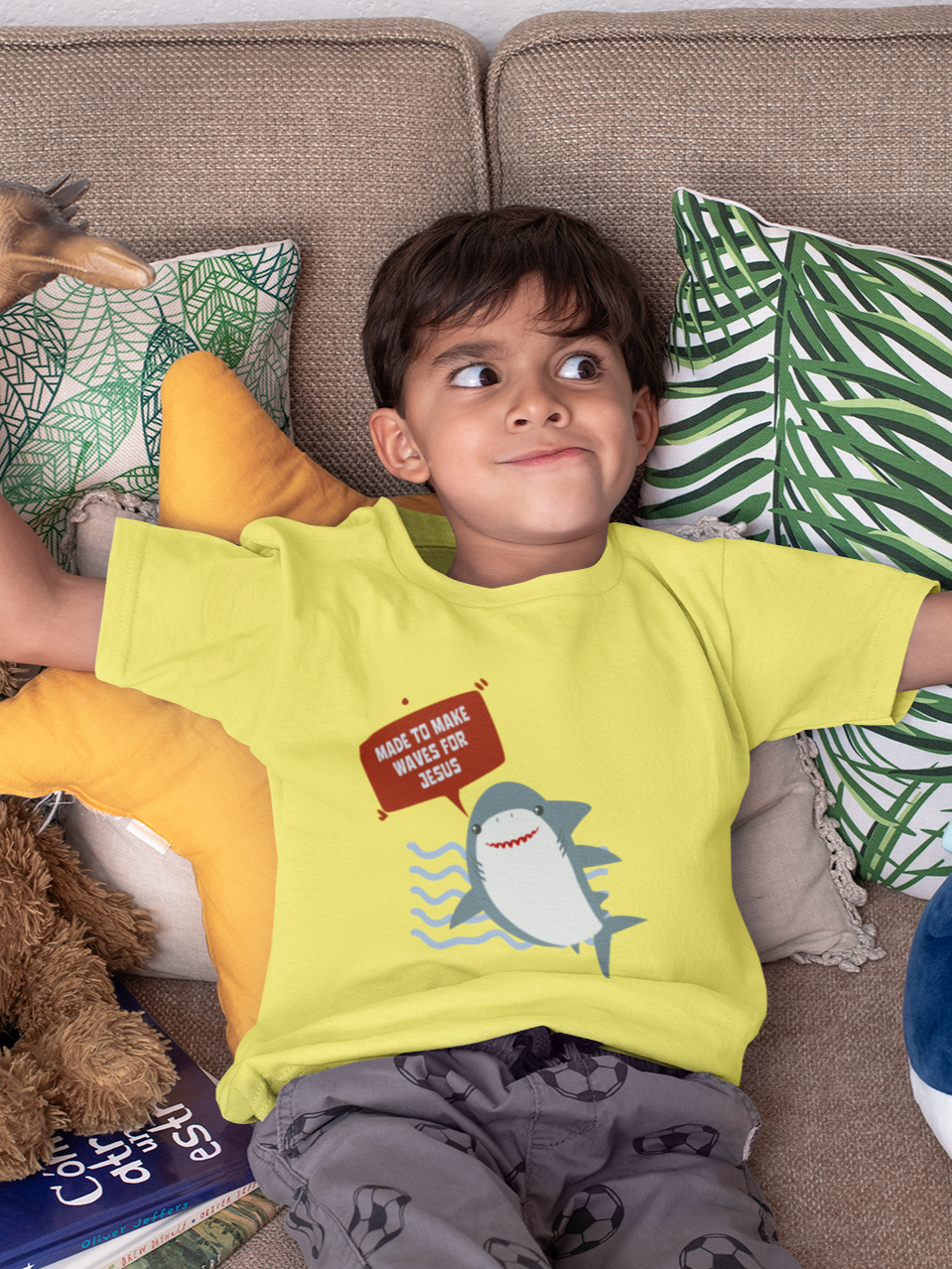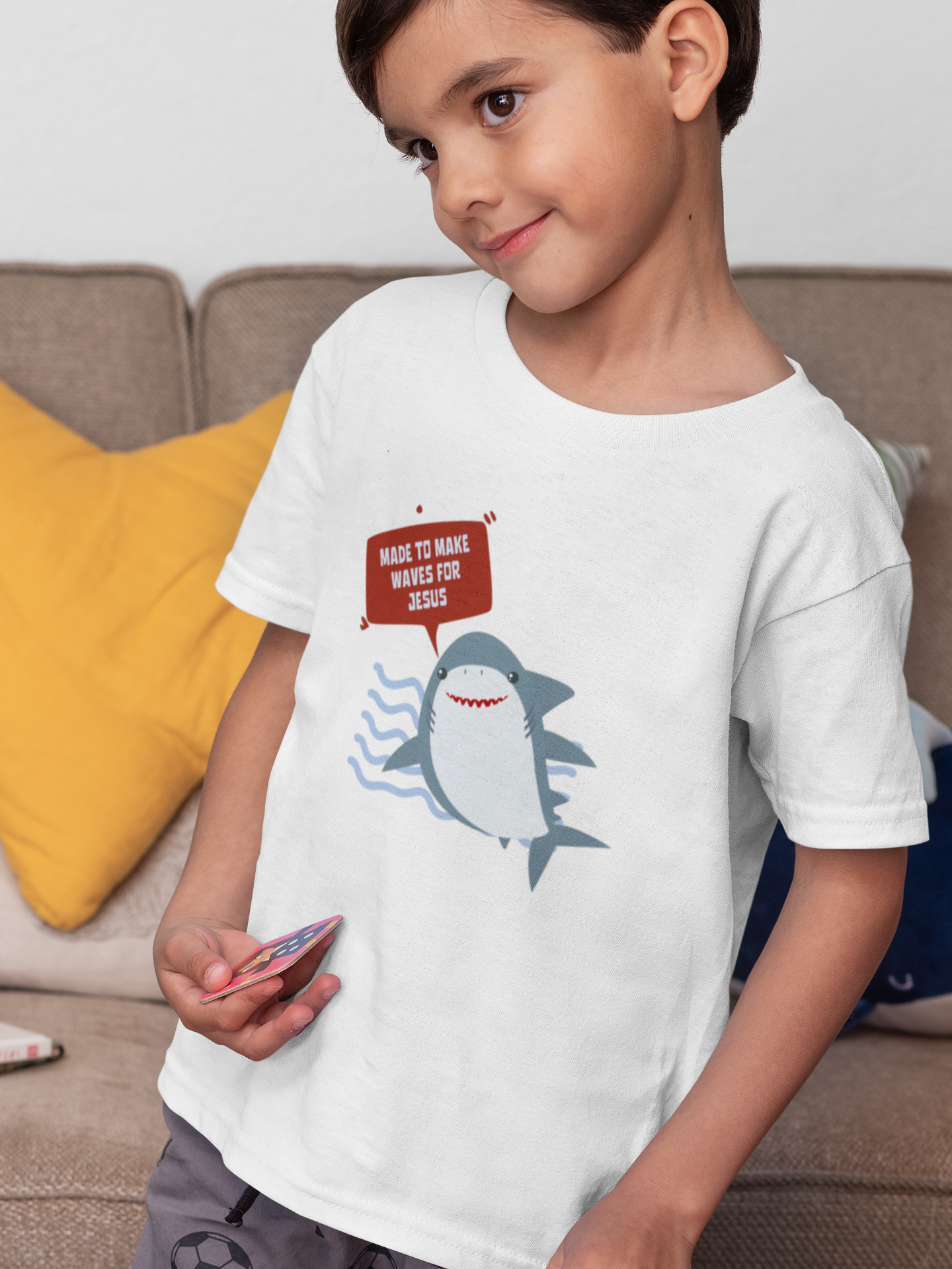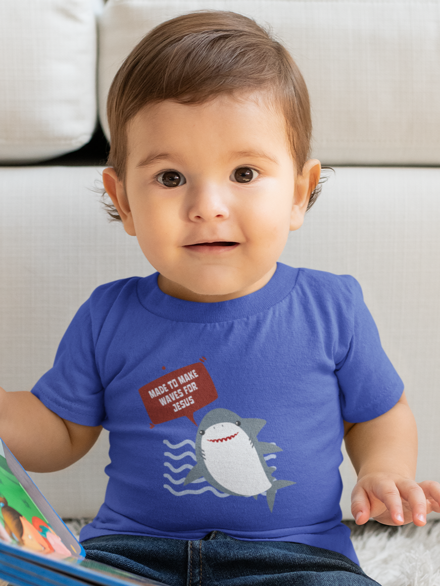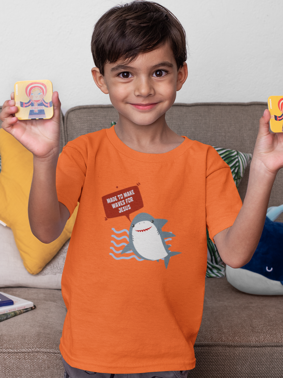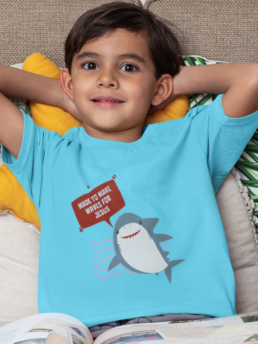 Introducing our "Made to Make Waves for Jesus" Kids' T-Shirt, a vibrant and fun design that celebrates the adventurous spirit of young believers. Featuring a playful shark graphic, this T-shirt is perfect for kids who are eager to share their faith with confidence and joy.