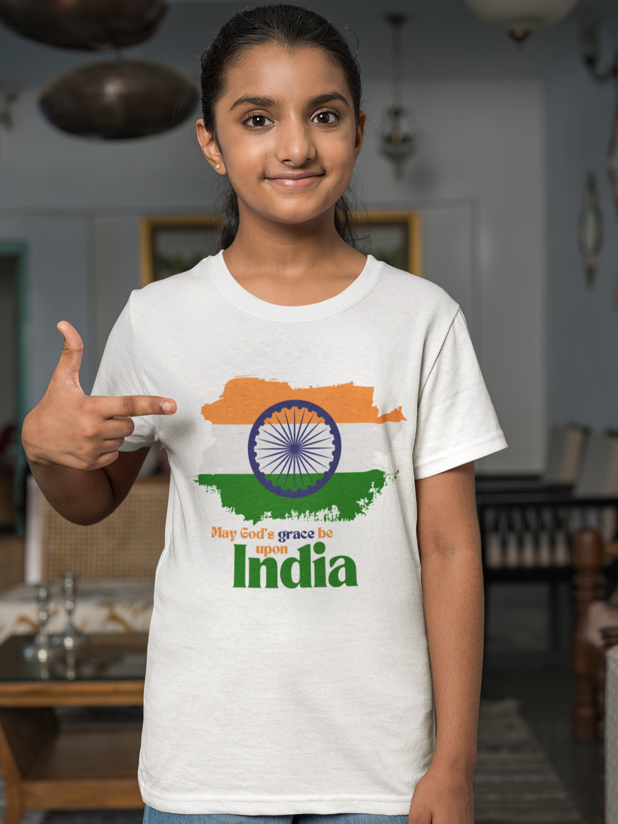 Celebrate and pray for our beautiful nation with the "May God's Grace Be Upon India" T-Shirt. This special design features a brushed representation of the Indian flag colors, symbolizing unity and pride in our country's heritage. Inspired by the verse from 2 Corinthians 13:14, which reminds us of the grace of the Lord Jesus Christ, the love of God, and the fellowship of the Holy Spirit, this t-shirt is a perfect blend of patriotism and faith.