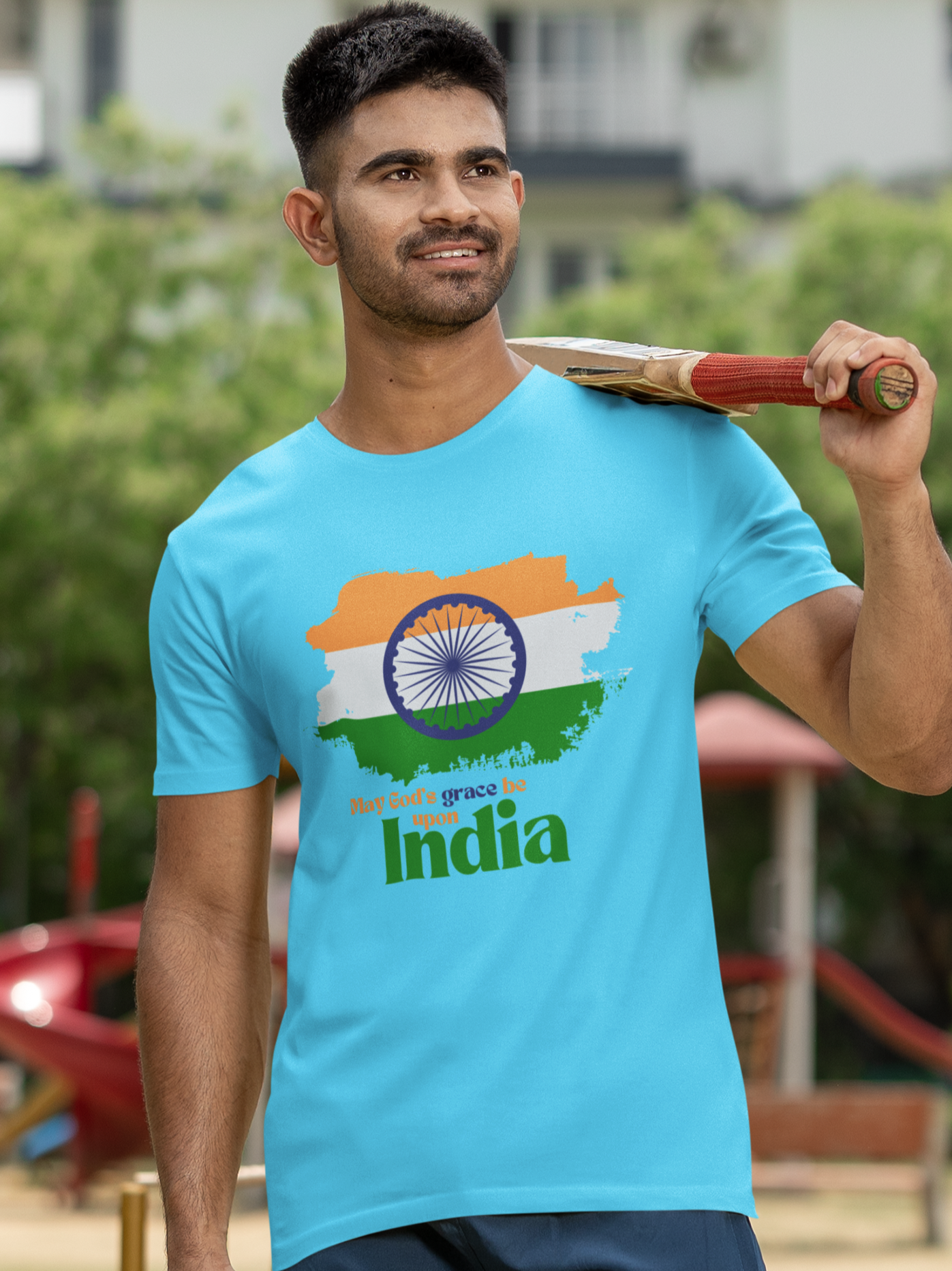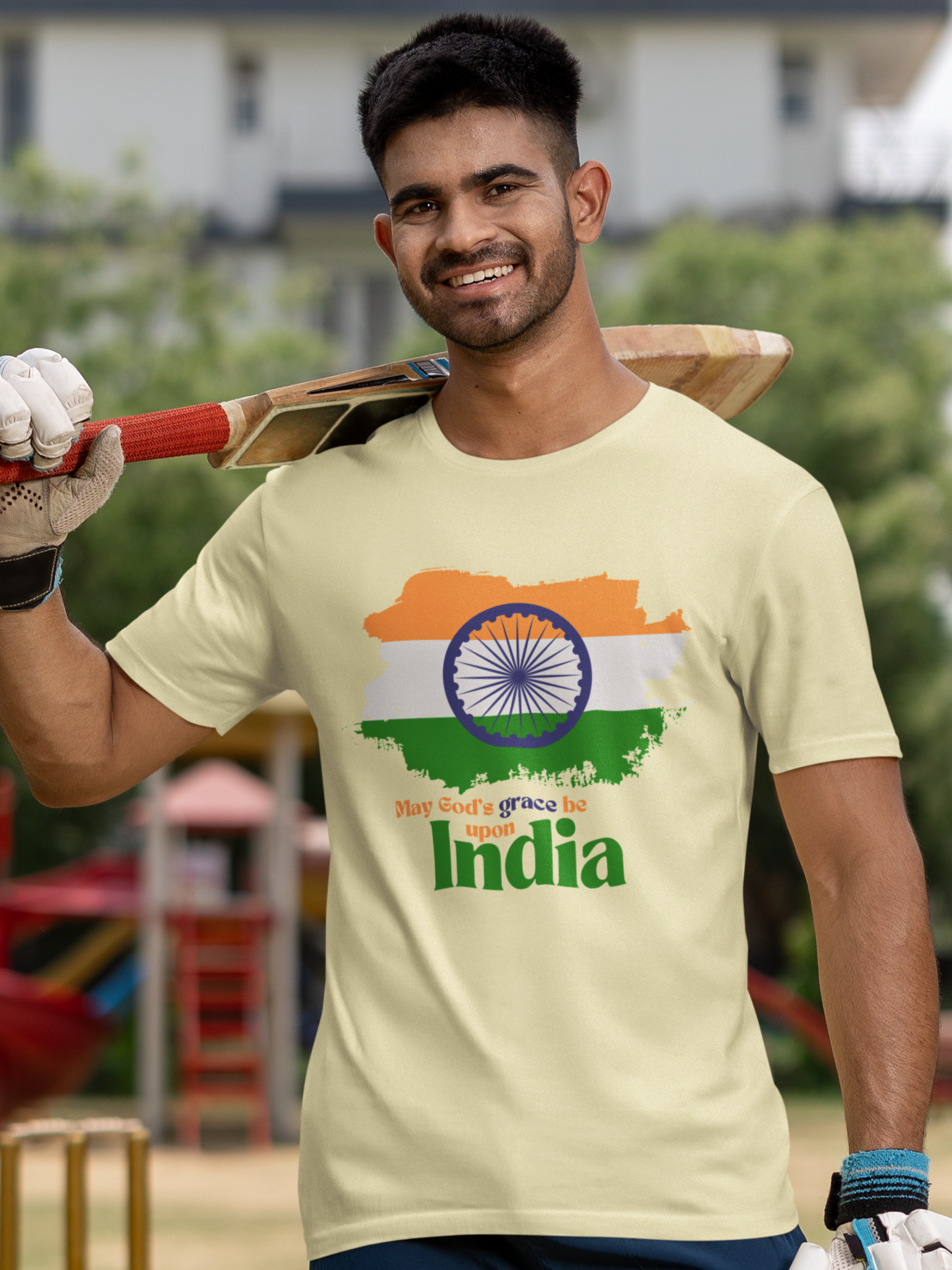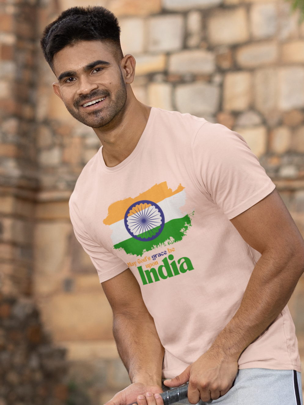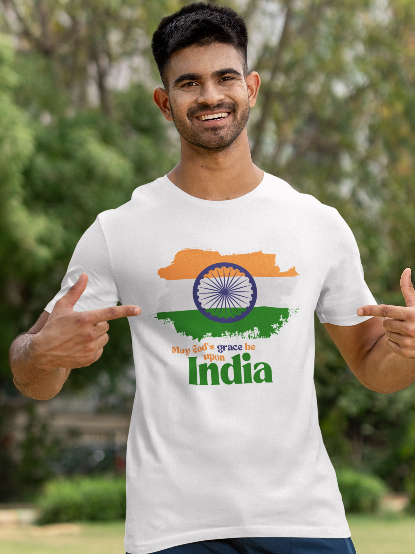 Celebrate and pray for our beautiful nation with the "May God's Grace Be Upon India" T-Shirt. This special design features a brushed representation of the Indian flag colors, symbolizing unity and pride in our country's heritage. Inspired by the verse from 2 Corinthians 13:14, which reminds us of the grace of the Lord Jesus Christ, the love of God, and the fellowship of the Holy Spirit, this t-shirt is a perfect blend of patriotism and faith.