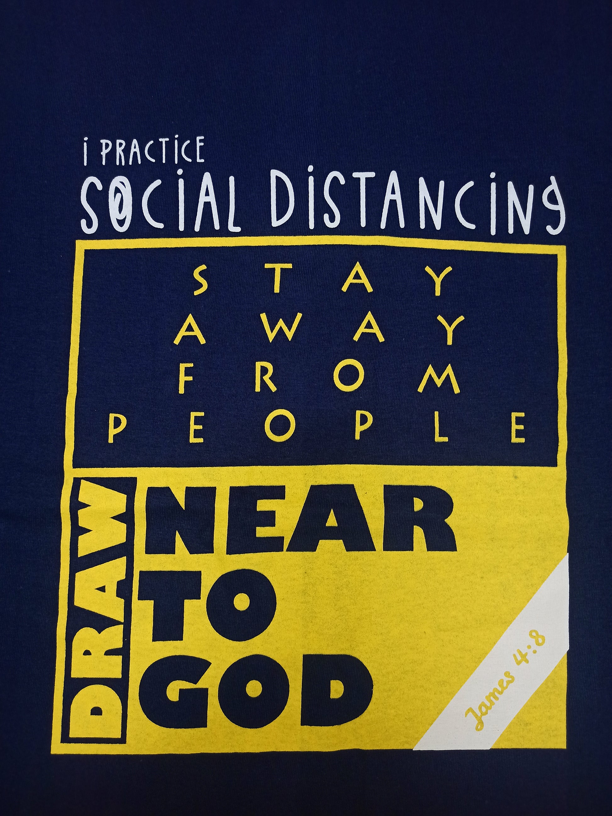 Social distancing means staying at least six feet away from another person to be cautious in our fight against the pandemic. But, in no way it stops us from being close to God. Let us spread some awareness along with the Word of God and let us draw ourselves with a sincere heart with this t-shirt.
