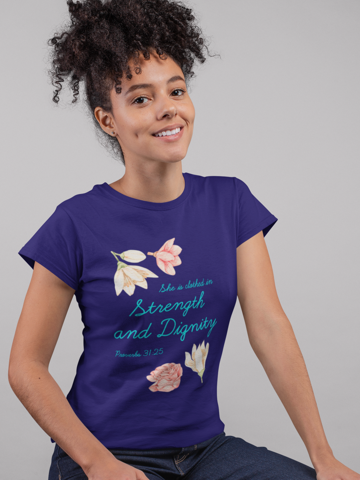 Navy blue ‘’She is clothed in strength and dignity’ women’s Christian t-shirt