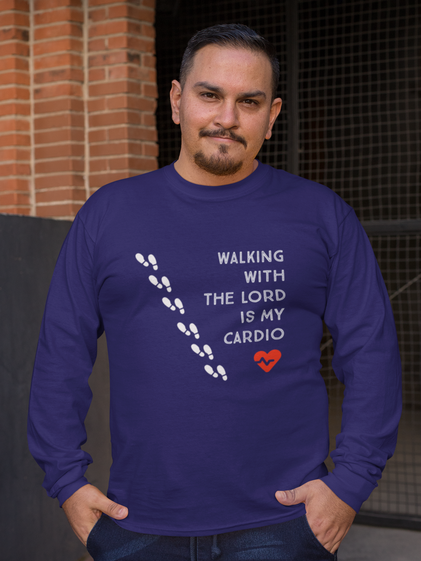 Navy Blue "Walking with the Lord is my cardio" Men’s full sleeve Christian t-shirt
