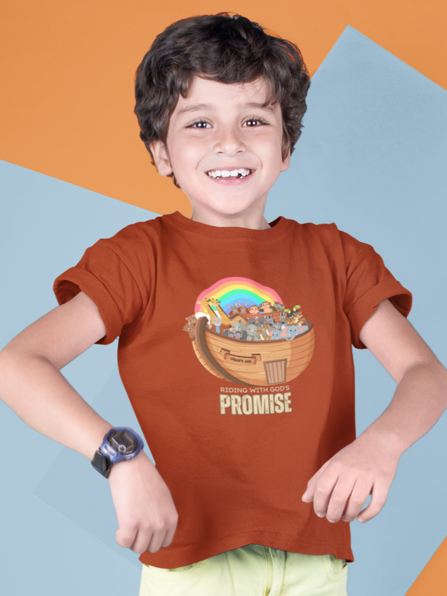 - "Riding with God's Promise" T-Shirt - Featuring a vibrant design of Noah's Ark, this brick red shirt reminds your child of God's faithfulness. Available in multiple sizes.