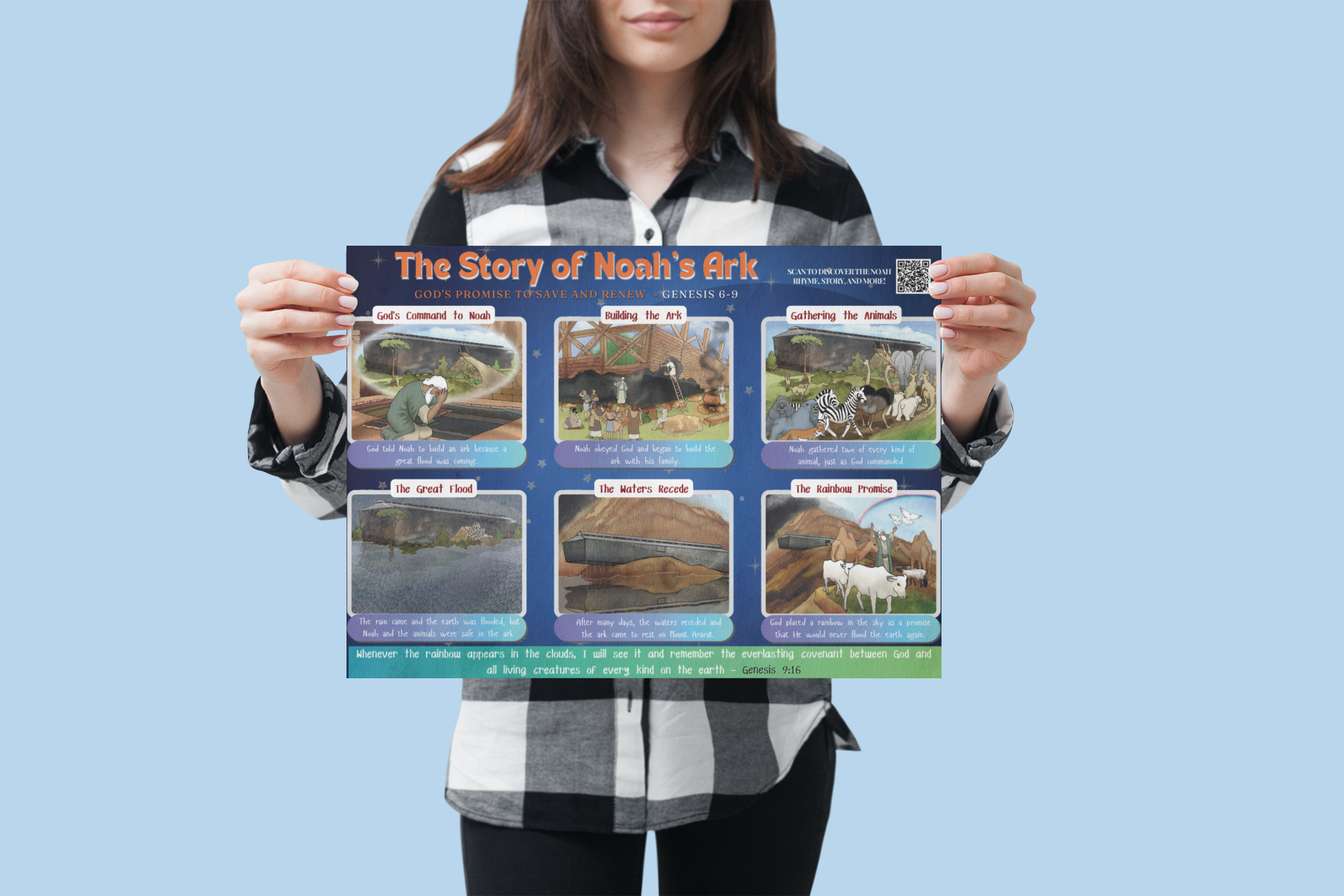 - A3 Size Wall Poster - A beautifully illustrated poster that tells the story of Noah in engaging tiles, perfect for daily inspiration. Includes a QR code that leads to interactive content—Noah's Ark Rhyme, Story, and more!