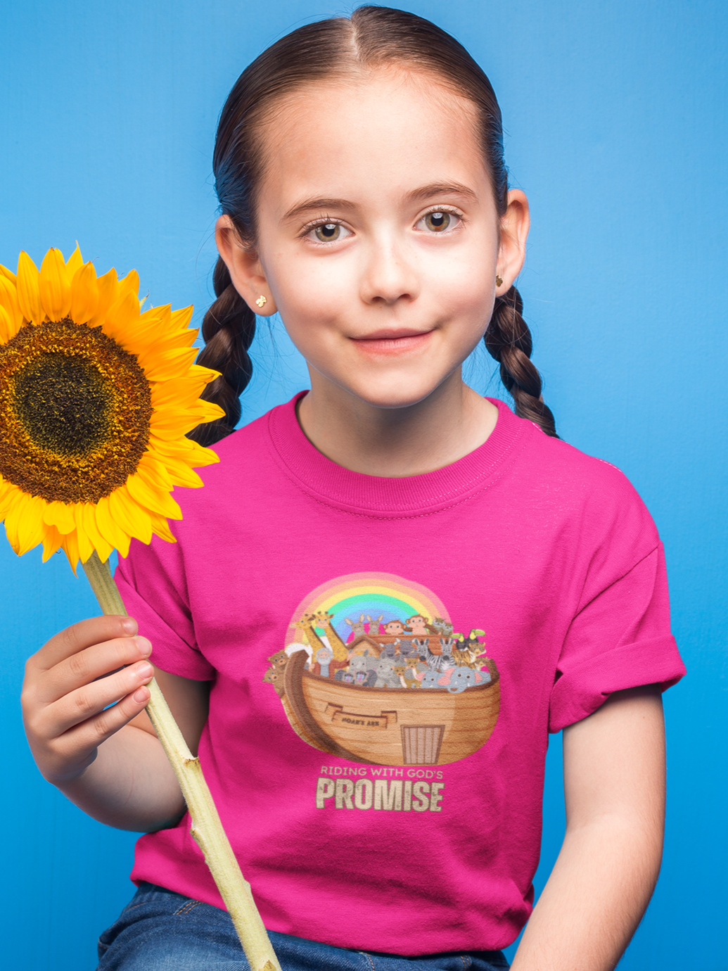 - "Riding with God's Promise" T-Shirt - Featuring a vibrant design of Noah's Ark, this brick red shirt reminds your child of God's faithfulness. Available in multiple sizes.
