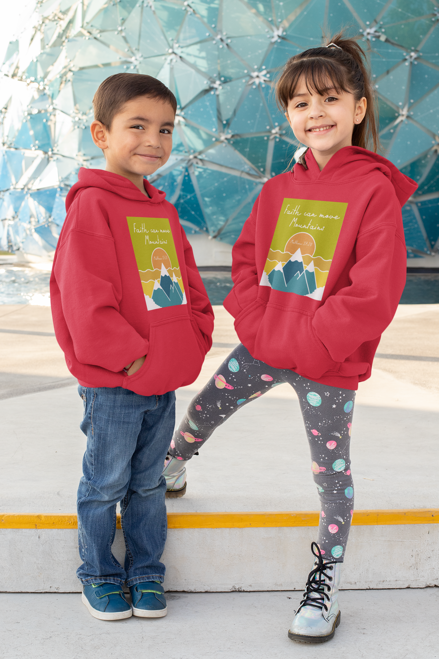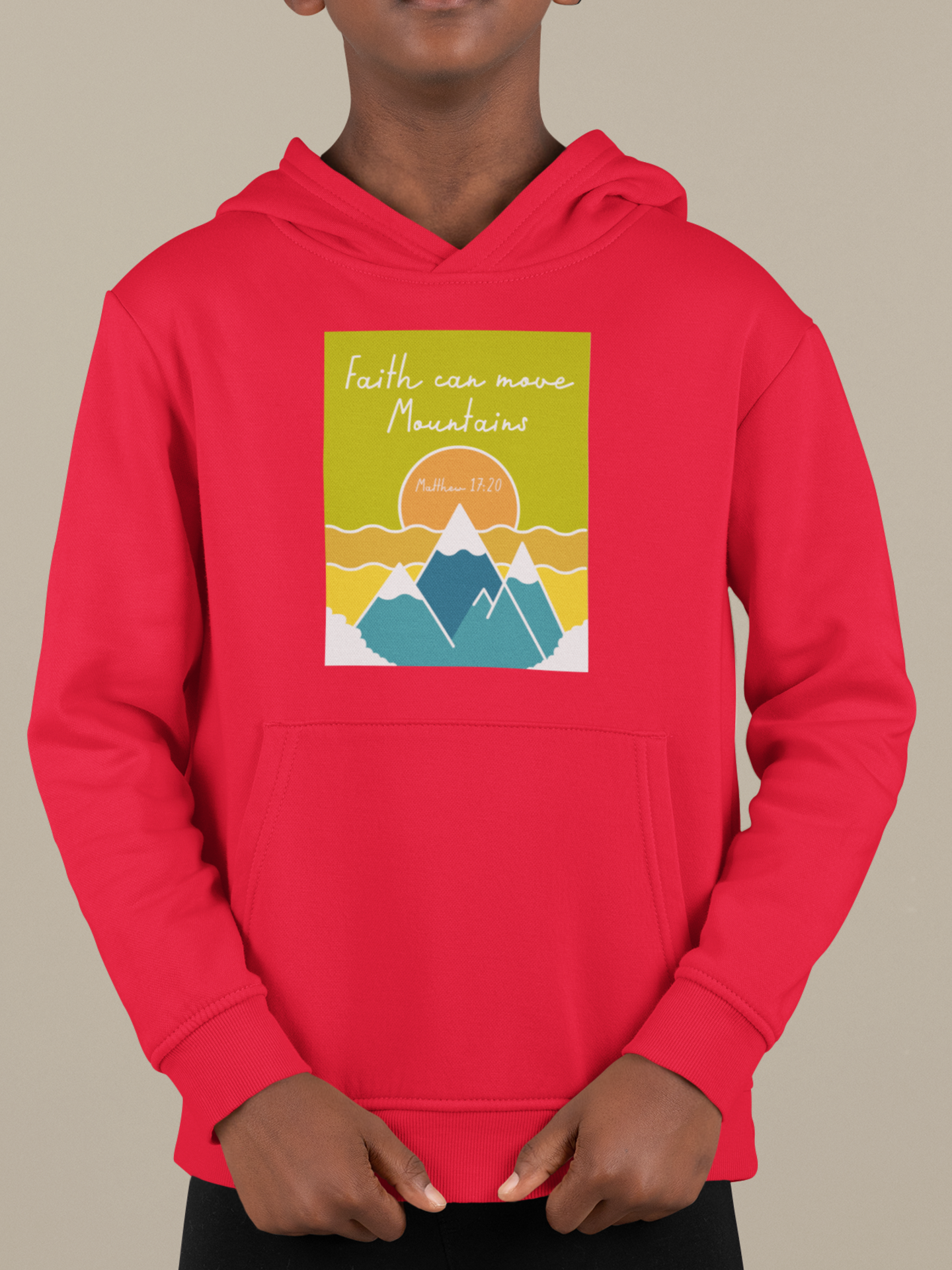 Red "Faith can move mountains" kids christian hooded sweatshirt