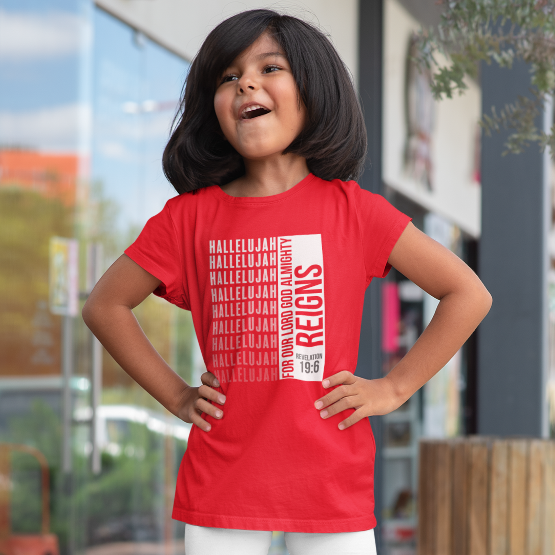 Red "Hallelujah for our Lord God Almighty reigns" girls christian t-shirt