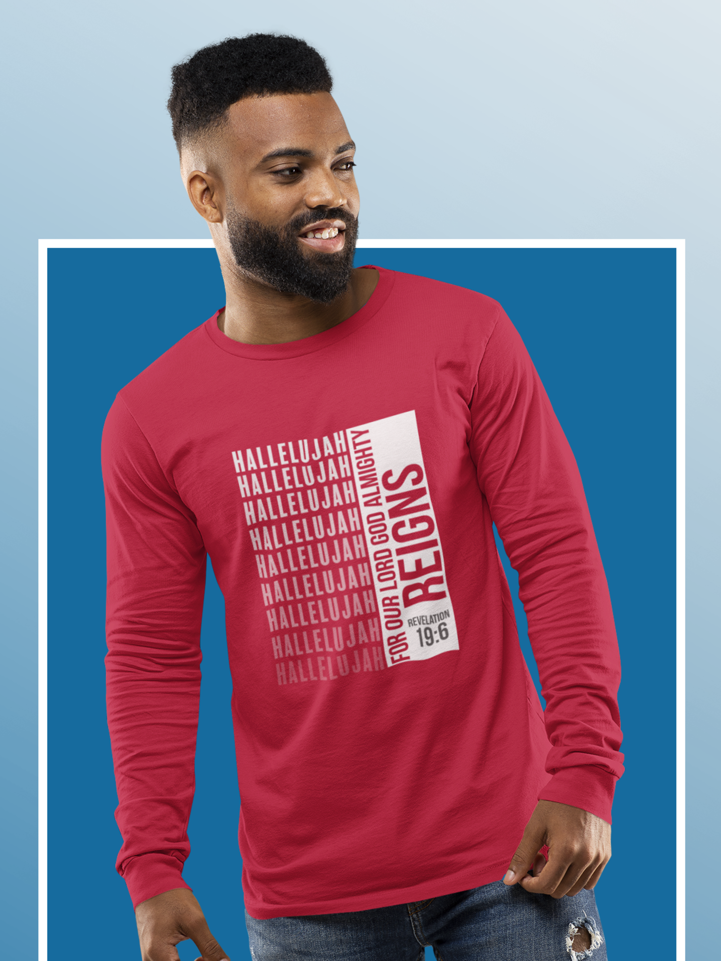 Red "Hallelujah for our Lord God Almighty reigns" Men’s full sleeve Christian t-shirt