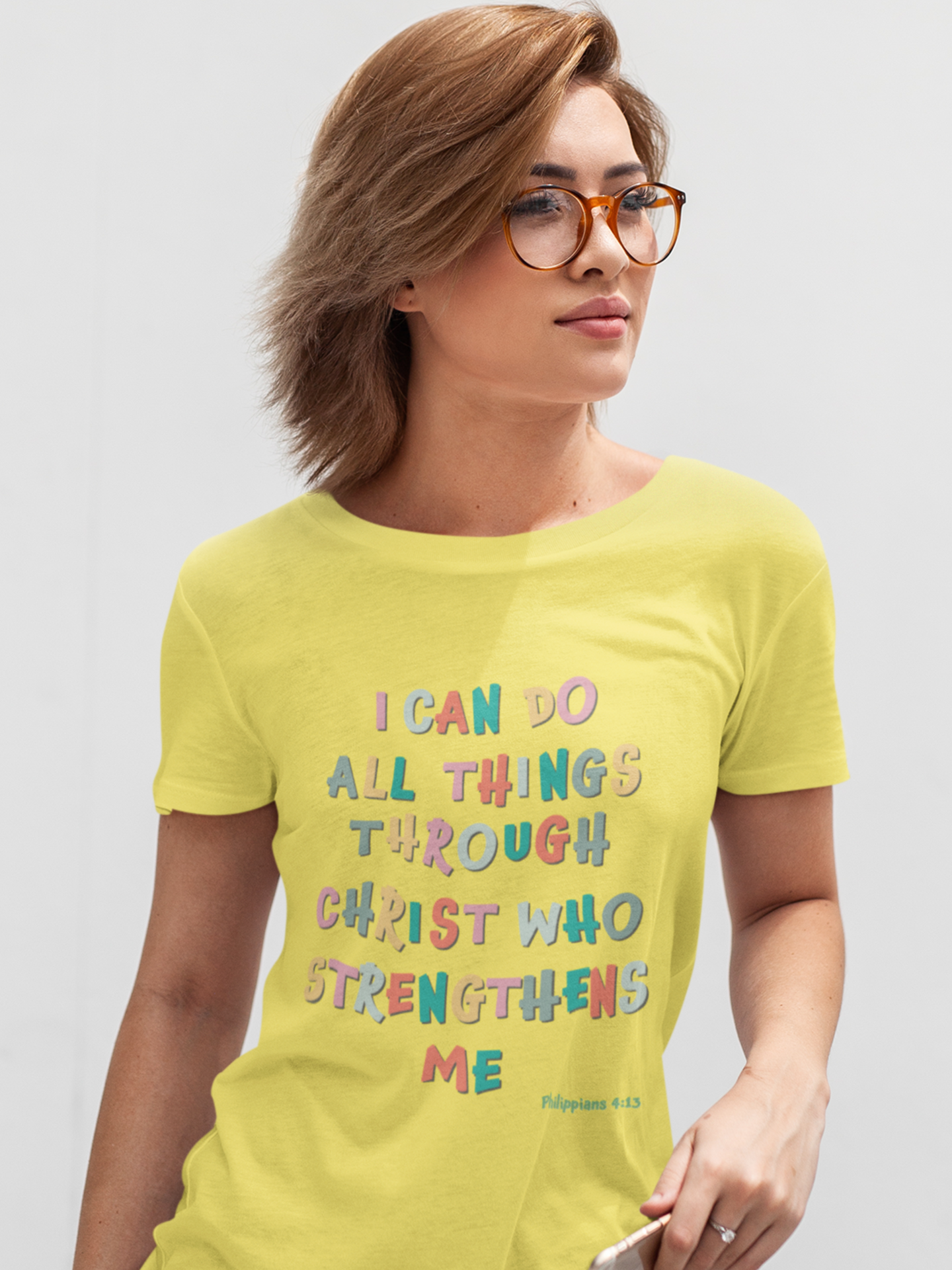 Yellow "I can do all things through Christ" women's christian t-shirt